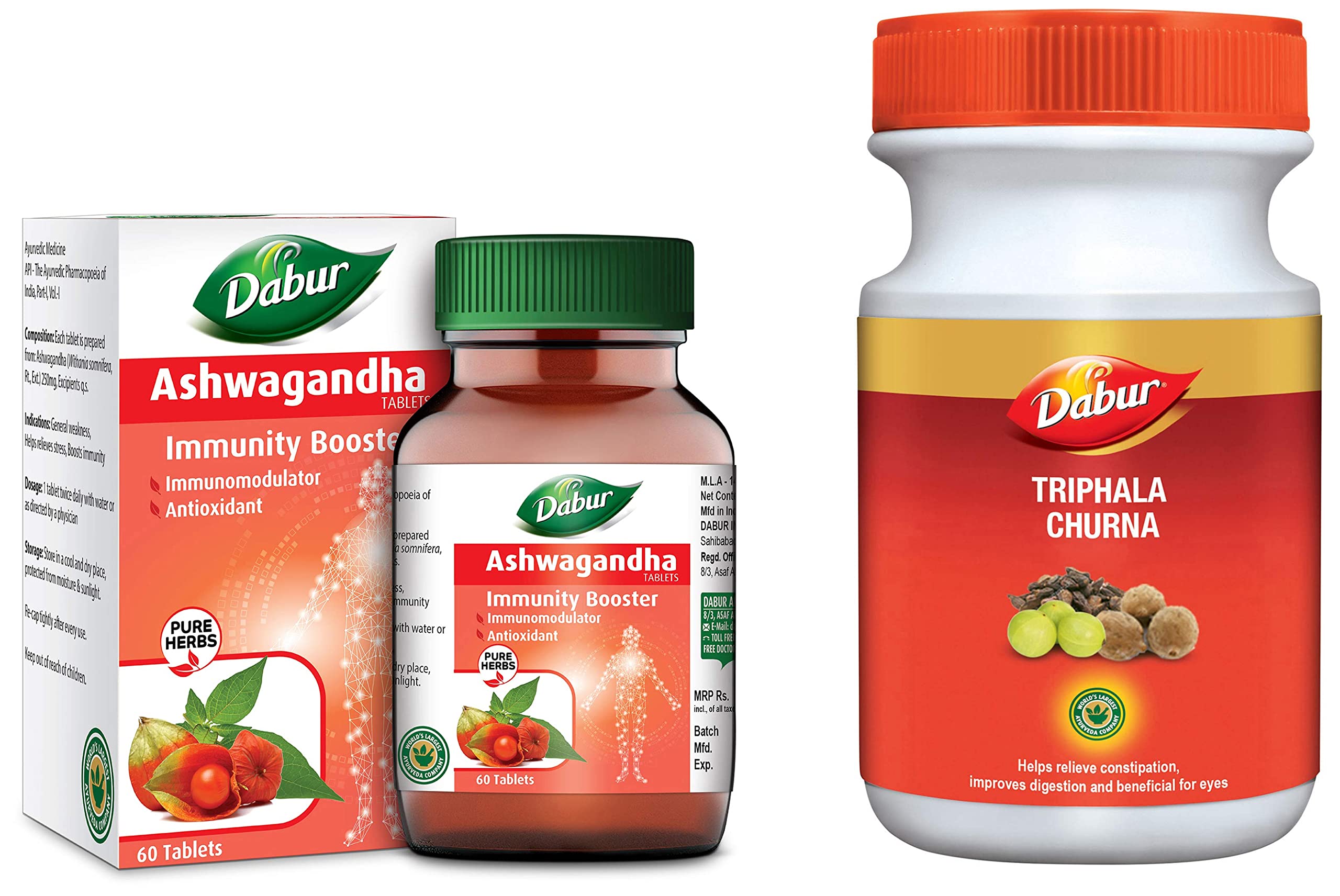 Dabur Ashwagandha - General Wellness Tablets | Stress Relief | Rich in Antioxidants - 60 tabletsWith over 130 years of expertise in ayurveda dabur has always been committed to the health and well-being of every household. Power packed with the age-old wisdom of ayurveda dabur pure herbs range of tablets is the latest offering from the house of dabur in fulfilling this vision. The immunity boosting dabur ashwagandha tablets in our range have the goodness of ashwagandha in it. Dabur Ashwagandha Tablets are 100 % Ayurvedic Immunity booster tablets that help strengthen your immunity. Ashwagandha is an immunomodulator that helps boost the immunity and it also has antioxidant properties. Ashwagandha also helps with general weakness and in relieving stress levels thereby making it a perfect choice for your overall health. For best results take one tablet twice everyday with water (or as directed by the physician)Dabur Triphala Churna Ayurvedic Remedy For Gastro Intestinal Health - 500gDabur Triphala Churna Ayurvedic Remedy for Gastro Intestinal Health - 500 g