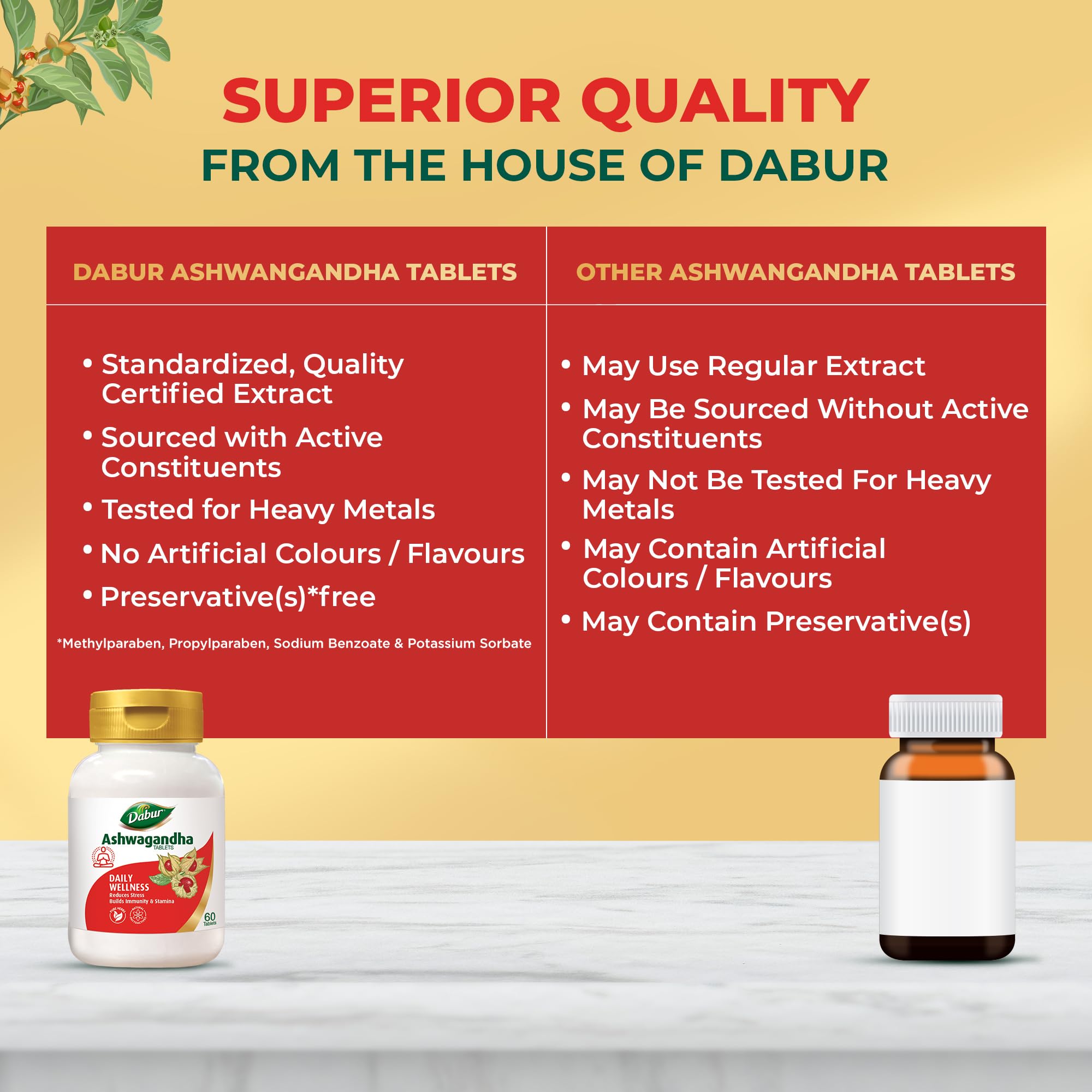 With over 130 years of expertise in ayurveda dabur has always been committed to the health and well-being of every household. Power packed with the age-old wisdom of ayurveda dabur pure herbs range of tablets is the latest offering from the house of dabur in fulfilling this vision. The immunity boosting dabur ashwagandha tablets in our range have the goodness of ashwagandha in it. Dabur Ashwagandha Tablets are 100 % Ayurvedic Immunity booster tablets that help strengthen your immunity. Ashwagandha is an immunomodulator that helps boost the immunity and it also has antioxidant properties. Ashwagandha also helps with general weakness and in relieving stress levels thereby making it a perfect choice for your overall health. For best results take one tablet twice everyday with water (or as directed by the physician)