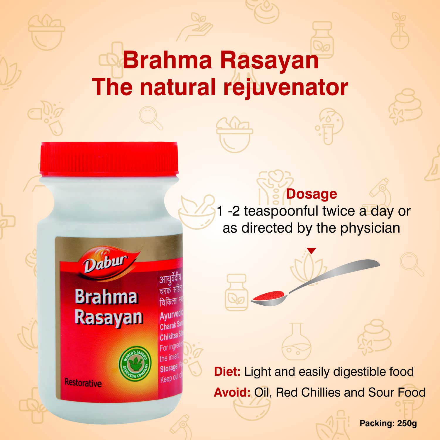 Dabur Brahm Rasayan is an ayurvedic remedy that improves memory mental strength cognition immunity general well-being etc. It is regarded as an excellent cerebral tonic. It is a paste of herbs and fruits that provide essential nutrients required to increase brain power. The Rasayan can also improve physical strength and health upon regular consumption as it provides the essential energy that people require to lead a healthy life.