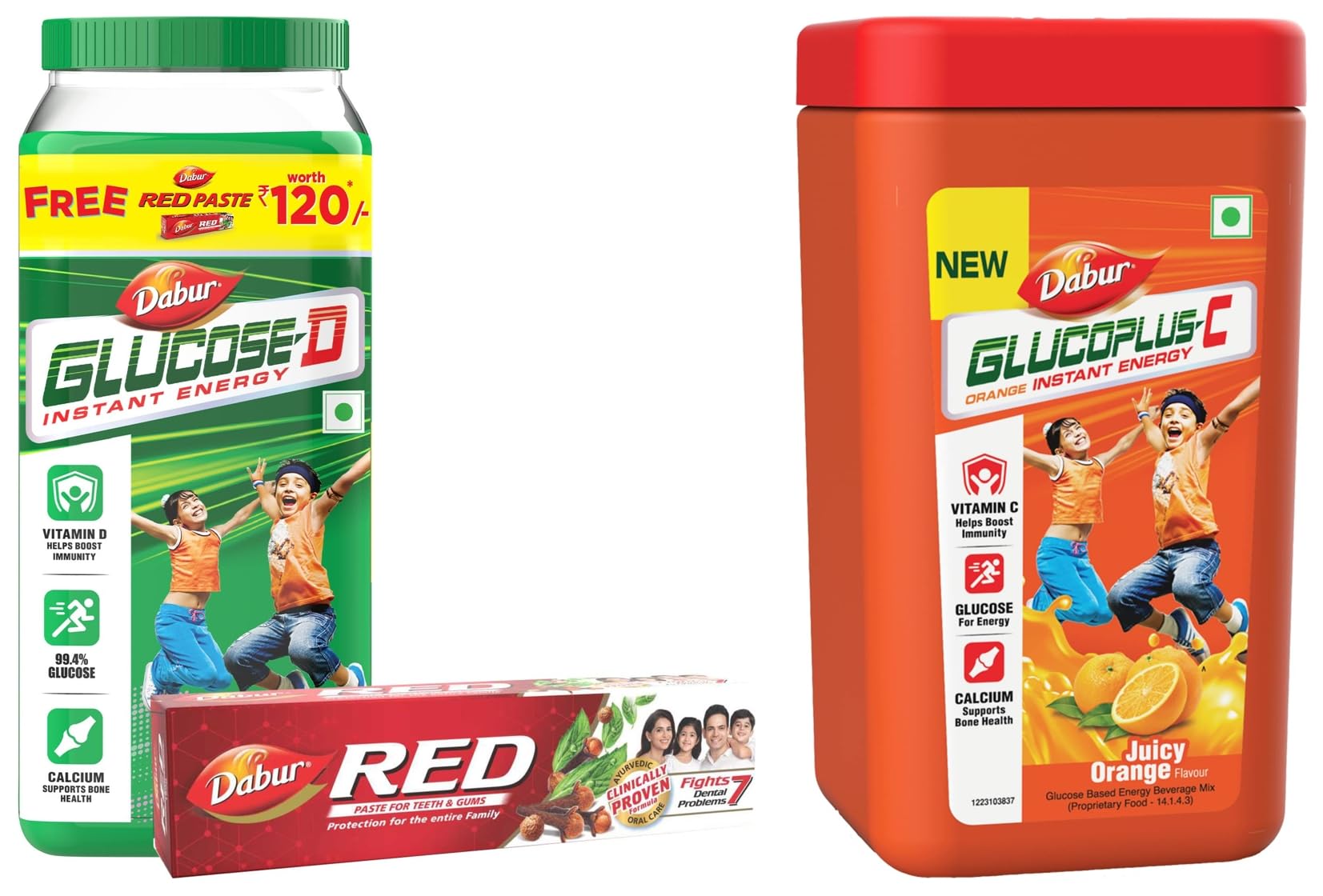 Dabur GlucoPlus-C Instant Energy Glucose Juicy & Tasty Orange Flavour - 400g Jar + Dabur Glucose D Instant Energy Glucose Juicy & Tasty - 1 kg with Dabur Red Paste 200g free