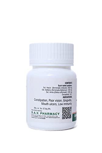 Each tablet contains Ext. Harar (Terminalia chebula)250mg.Ext. Bahera(Terminalia bellerica)125mg. Ext Amla (Emblica officinale)125mg.Excipients Q.S.