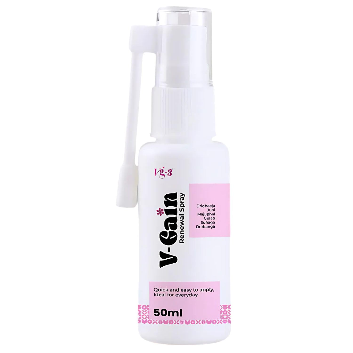 VGain Renewal Spray is an advanced Ayurvedic formulation designed for daily feminine intimate care. Its unique time-tested blend of traditional herbsDridranga Suhaga Dridbeeja Majuphal Gulab and Juhiworks to provide long-lasting freshness comfort and a revitalized feeling throughout the day. Crafted with a focus on quality and safety this spray is WHO-GMP certified making it a trusted choice for women seeking a natural and effective solution for intimate hygiene.With its convenient spray design VGain makes intimate care quick and easyideal for active lifestyles travel and everyday use. Maintain freshness and confidence every day with this gentle and soothing Ayurvedic formulation.ð± Why Choose VGain Renewal Spray?Ayurvedic Formulation: Rich in traditional herbs like Dridranga Suhaga Majuphal Gulab and Juhi for natural care.All-Day Freshness: Provides long-lasting comfort and a soothing sensation throughout the day.Safe & Gentle: WHO-GMP certified for external use making it ideal for daily feminine care.Easy to Use: Comes with a convenient applicator for quick and precise application.Compact & Travel-Friendly: 50 ml pack perfect for carrying in your handbag or travel kit.Ideal for All Women: Gentle enough for daily use providing a clean confident and revitalized feeling every day.ð¡ How to UseShake the bottle well before use.Gently attach the applicator nozzle to the bottle.Spray 34 times in the external area for a refreshing experience.Remove the applicator carefully after use and wash with clean water.Use daily or as required for best results.