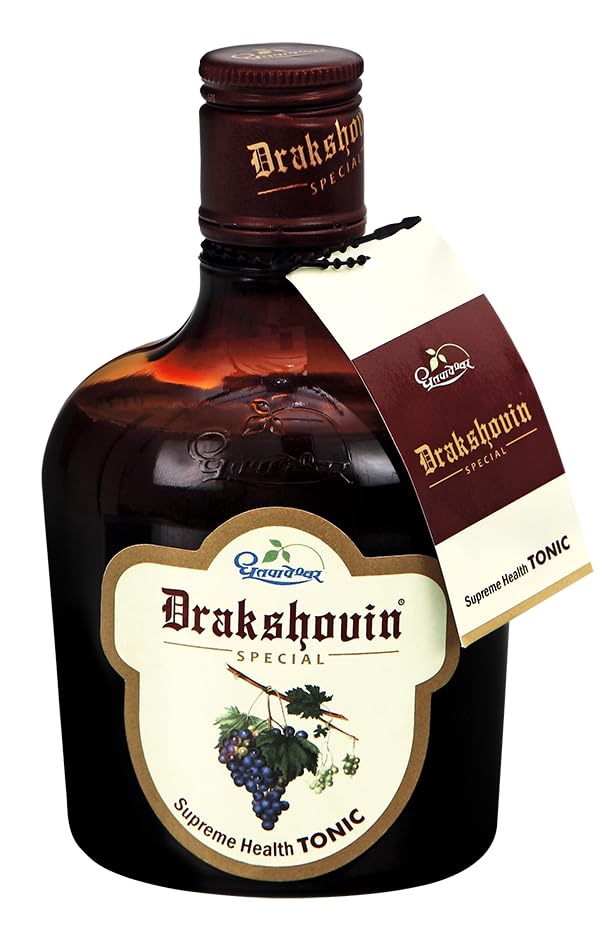 Dhootapapeshwar Drakshovin Special Syrup is a high-quality Ayurvedic tonic formulated with a blend of Draksha Ashwagandha Brahmi and Shatavari. These herbs have been traditionally used in Ayurveda to support general health and well-being. This herbal tonic is carefully crafted to support digestion and promote a healthy appetite. It is an ideal choice for individuals looking to enhance digestive comfort and maintain a balanced appetite. In addition to its digestive benefits Drakshovin Special Syrup helps maintain energy throughout the day. It reduces fatigue and supports physical strength making it a great option for those who want to maintain high energy levels. This Ayurvedic tonic also includes Brahmi and Ashwagandha which are believed to help support focus and clarity. Drakshovin Special is a natural solution to help promote concentration. With over 150 years of Ayurvedic expertise Dhootapapeshwar Drakshovin Special is a trusted choice for daily wellness. The formula is free from harmful chemicals and preservatives offering a natural way to enhance your health and well-being.