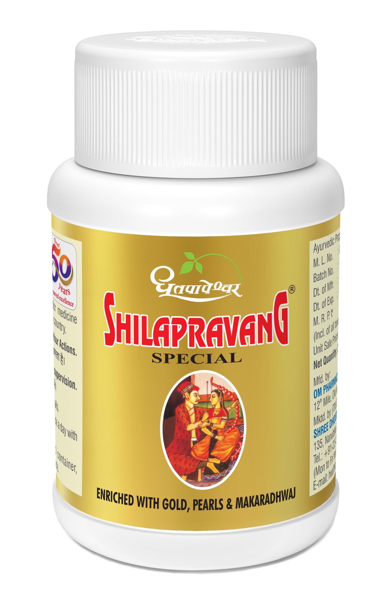 Dhootapapeshwar Shilapravang Special Tablets are a potent Ayurvedic formulation designed to support strength stamina and endurance. This unique formula combines the goodness of Shodhit Shilajatu Ashwagandha and other medicinal herbs enriched with Suvarna Bhasma Mouktik Pishti and Makardhwaj. Shilapravang Special nourishes all the tissues in the body particularly focusing on Shukra Dhatu (reproductive tissues) which is essential for reproductive health. It works to improve physical strength increase energy and enhance stamina while supporting overall well-being. In addition to physical benefits Shilapravang Special helps to reduce stress offering calming effects and promoting overall wellness. The enriching ingredients like gold pearls and Makardhwaj provide a holistic approach to health by enhancing vitality and promoting balance. With over 150 years of Ayurvedic excellence Dhootapapeshwar Shilapravang Special Tablets provide a trusted natural solution to improve your overall physical health and well-being.