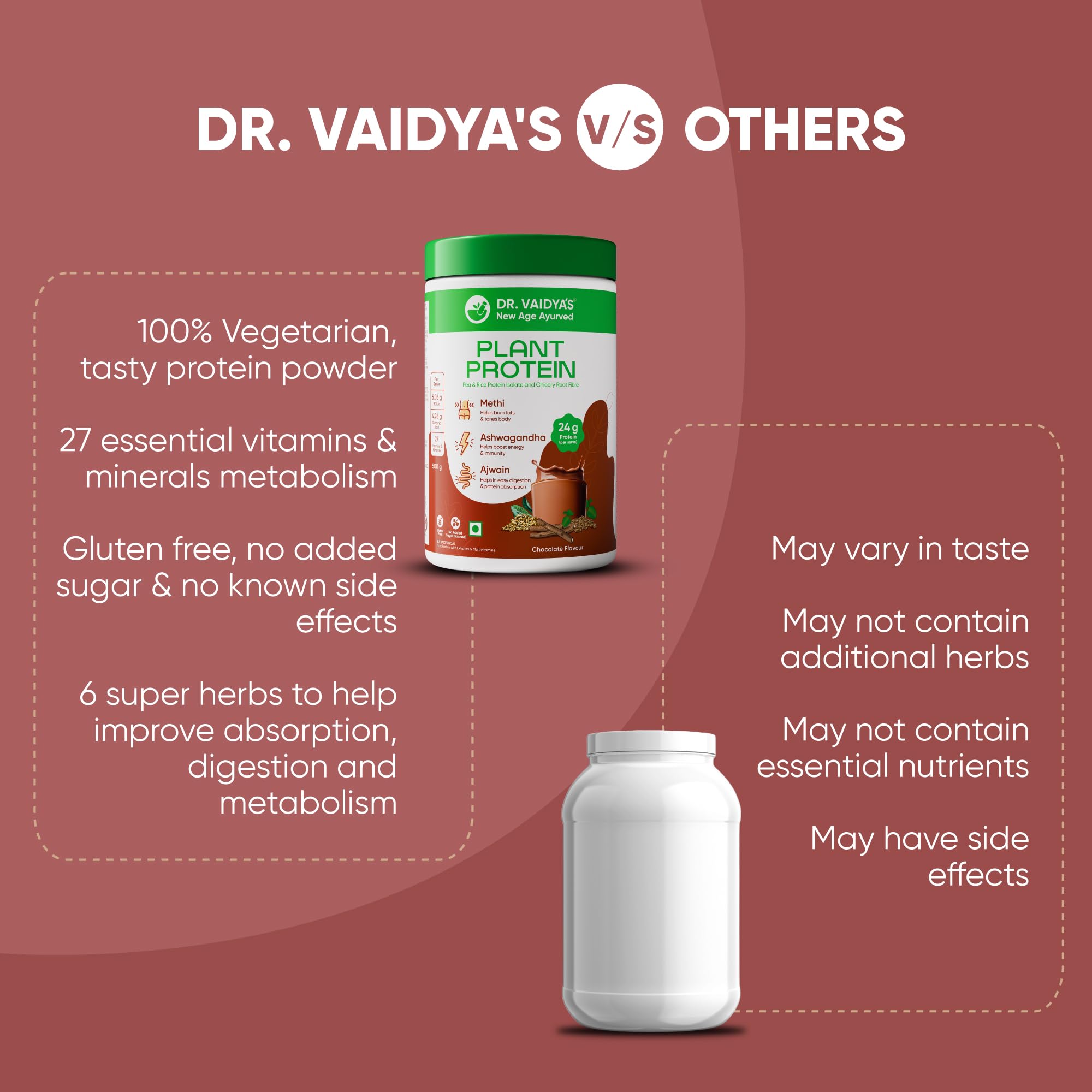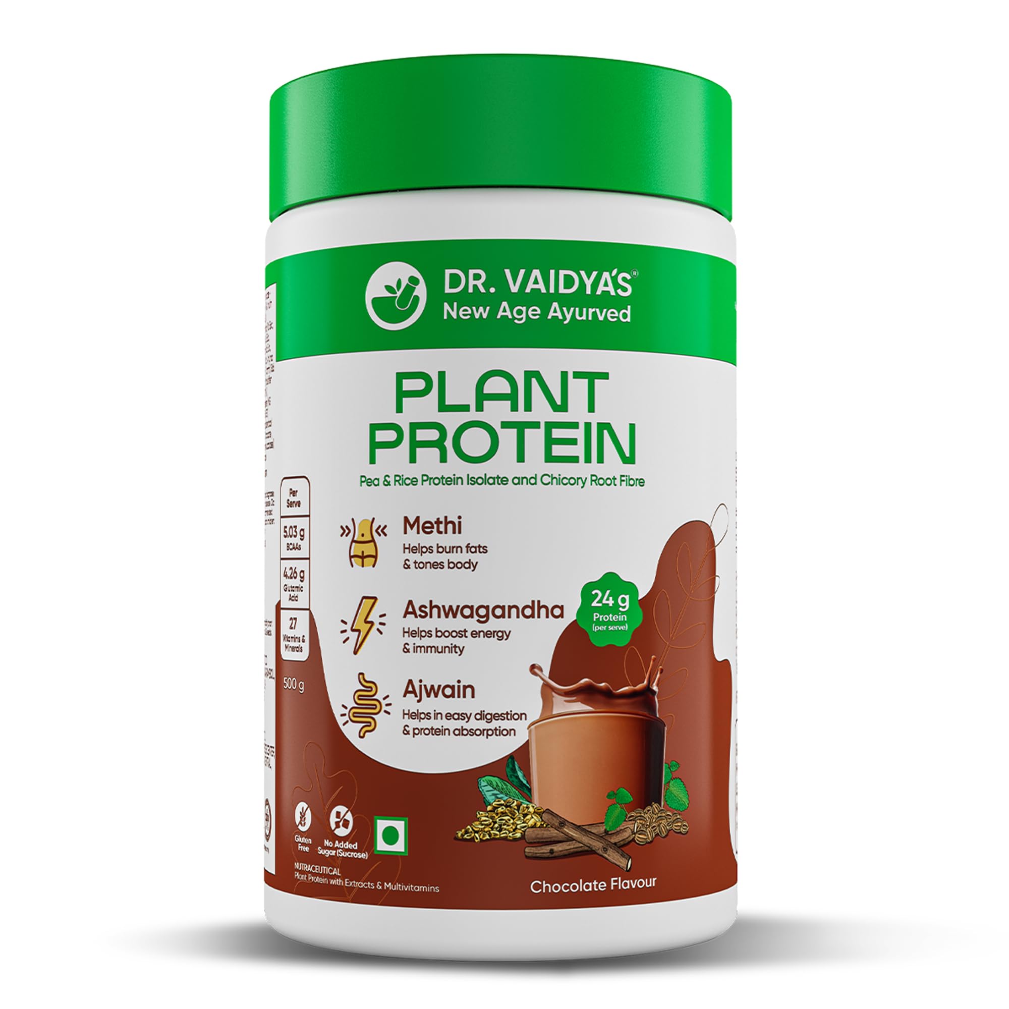 ASHWAGANDHA: Dr. Vaidya's Plant Protein Powder boosts energy and immunity levels with Ashwagandha.