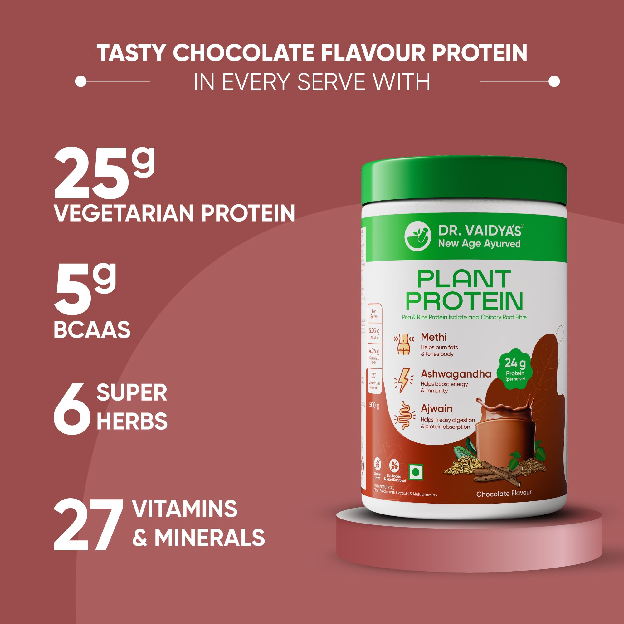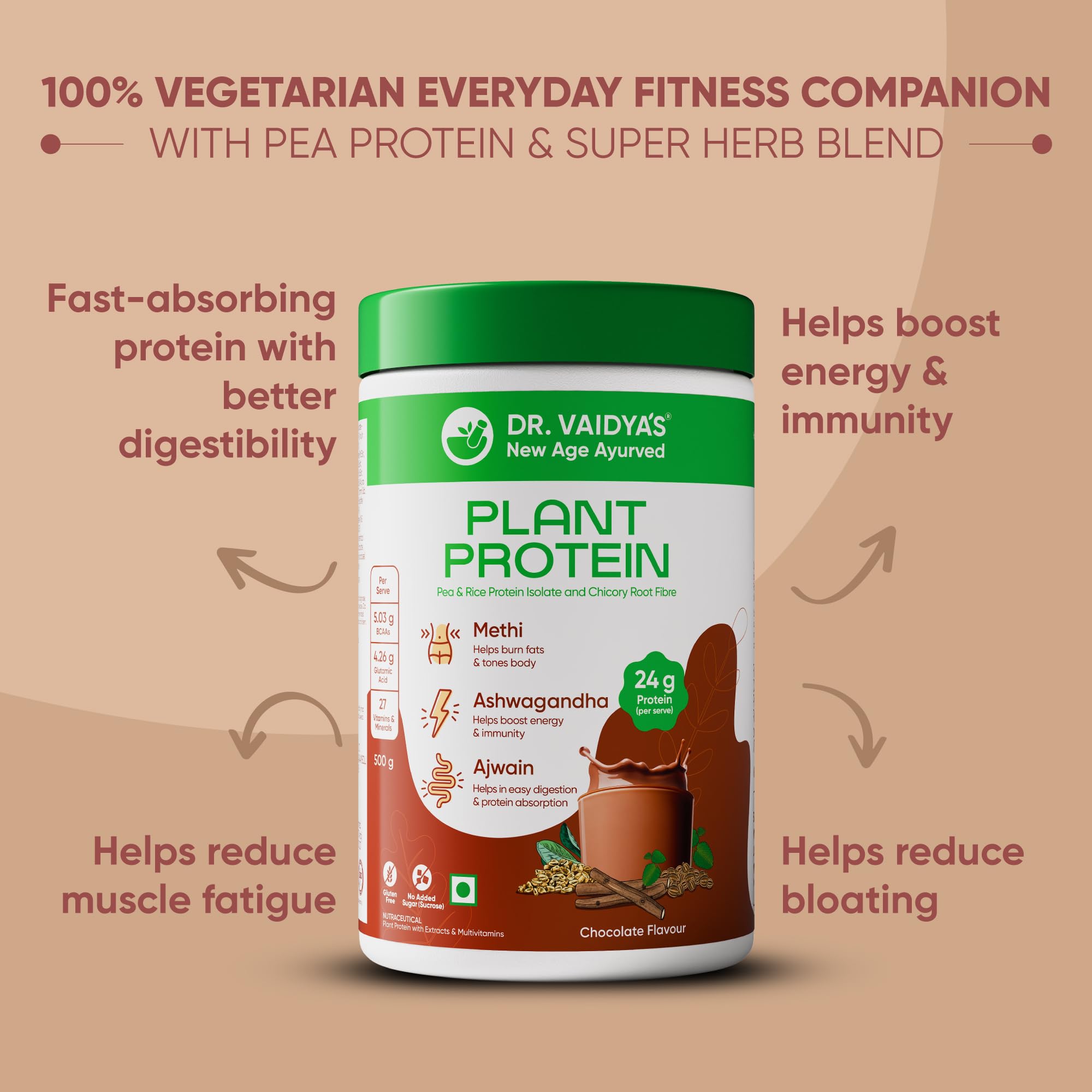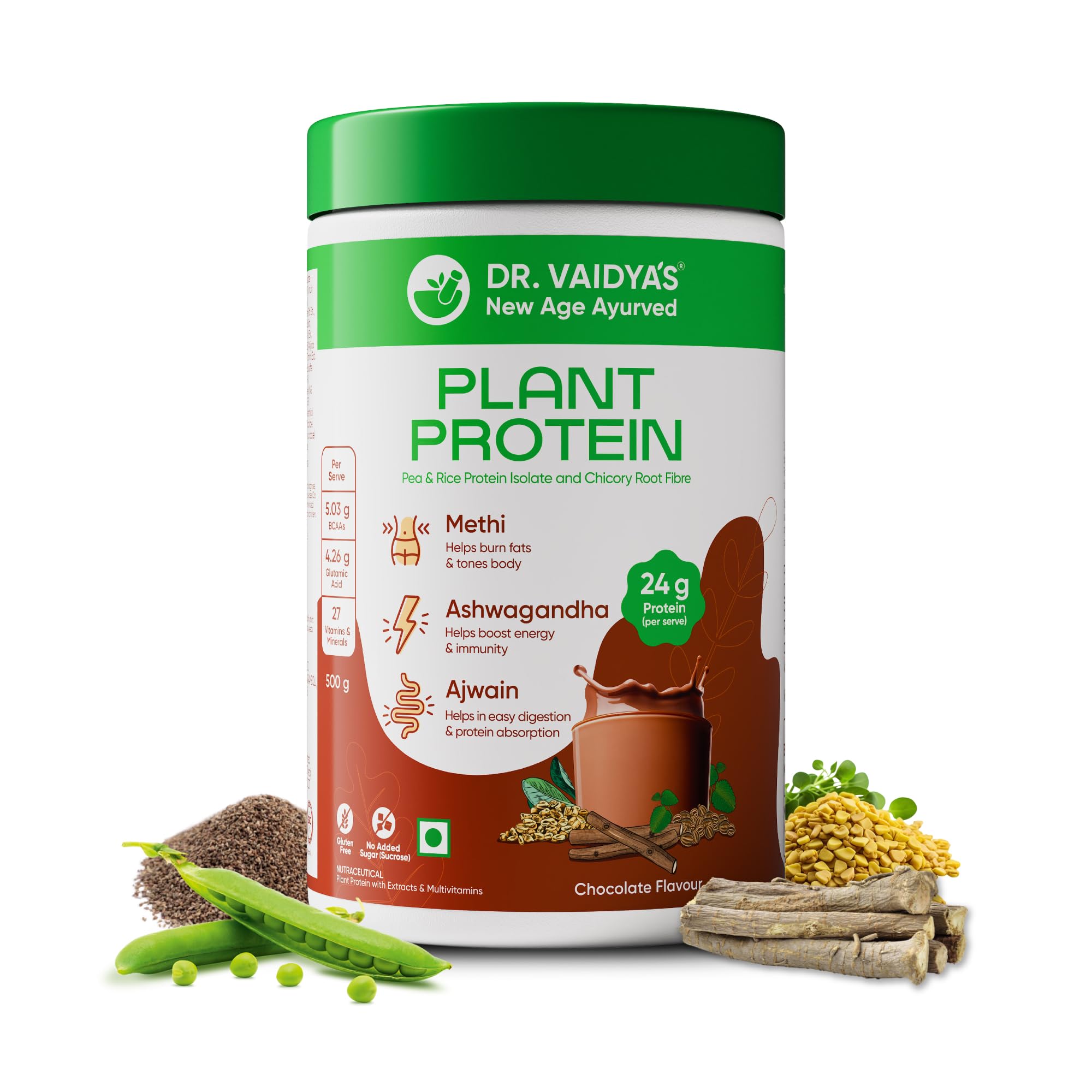 Dr Vaidya's Plant Protein Powder | Gut Health | 80% Pea Protein | Methi Ashwagandha Ajwain | Gluten Free | No Added Sugar | Chocolate Flavour (500g)