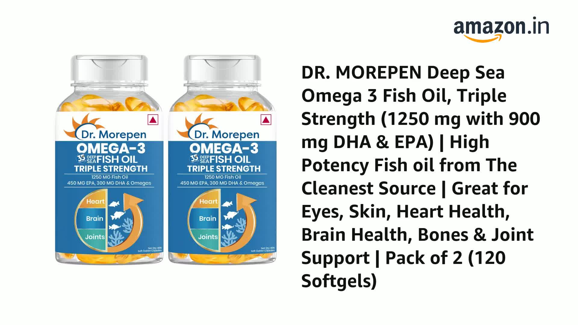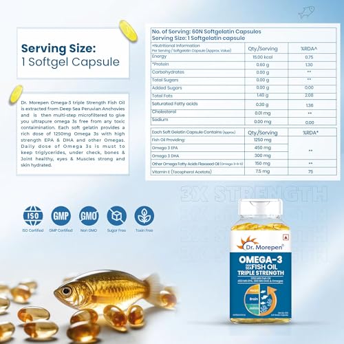 These capsules are containing higher amounts of EPA (450 mg) and DHA (300 mg). There are very few companies which are providing Omega-3 capsules with this strength. No fishy smell, easy to gulp. Kudos to Dr. Morepen