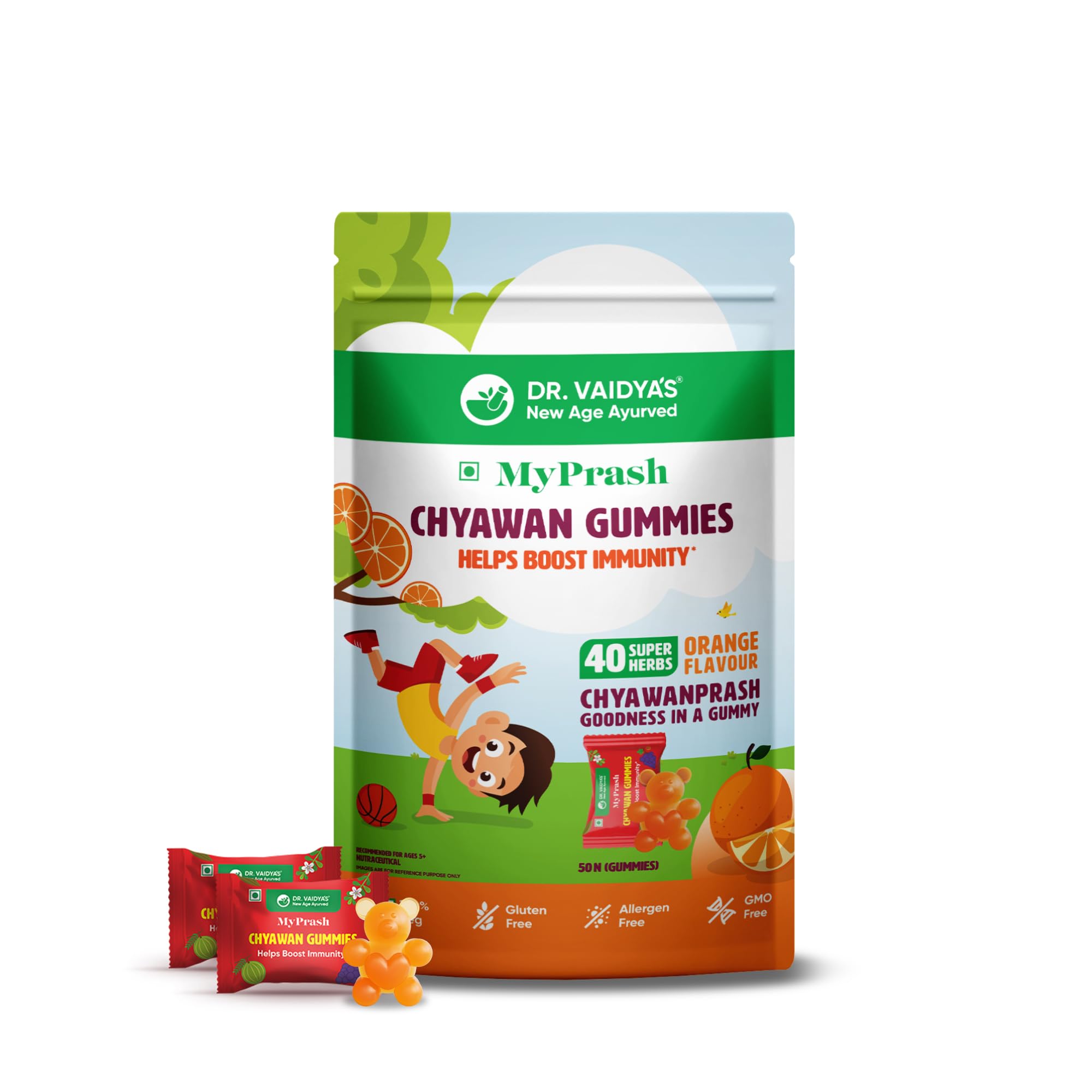 Earlier Chyawanprash was only available in its time-tested paste form. Now the Ayurvedic experts atDR. VAIDYA'S new age ayurveda have made the goodness of Chyawanprash more accessible with the new offering Chyawan Gummies. This yummy gummy is sure to make it easier for you to give your child the benefits of Chyawanprash without any fuss. Chyawan Gummies contains 40 super herbs found in Chyawanprash that are critical for kids' growing minds and bodies. These herbs are known to help boost immunity combat infections improve appetite support digestion and enhance respiratory function. Each gummy is also individually wrapped to make it convenient to add to your child's tiffin. Best of all two Chyawan Gummies provide similar health benefits as one teaspoon of traditional Chyawanprash. And not only kids but adults can also enjoy eating these gummies for the many health benefits of Chyawanprash. While the full list of super herbs in Chyawan Gummies can be found on the packaging there are 4 key ingredients in the gummies: â Amla helps boost long-term immunity â Harada helps support digestion and enhance appetite â Draksha (Grapes) help combat weakness and fatigue â Pippali helps support healthy respiratory function Here's why you should buy Chyawan Gummies: â Formulated by a team of Ayurvedic experts â Made with 100% Ayurvedic actives â Contain clinically researched ingredients â Does not contain metals artificial colours artificial flavours and harmful preservatives â Cause no known side effects â Safe for kids and adults