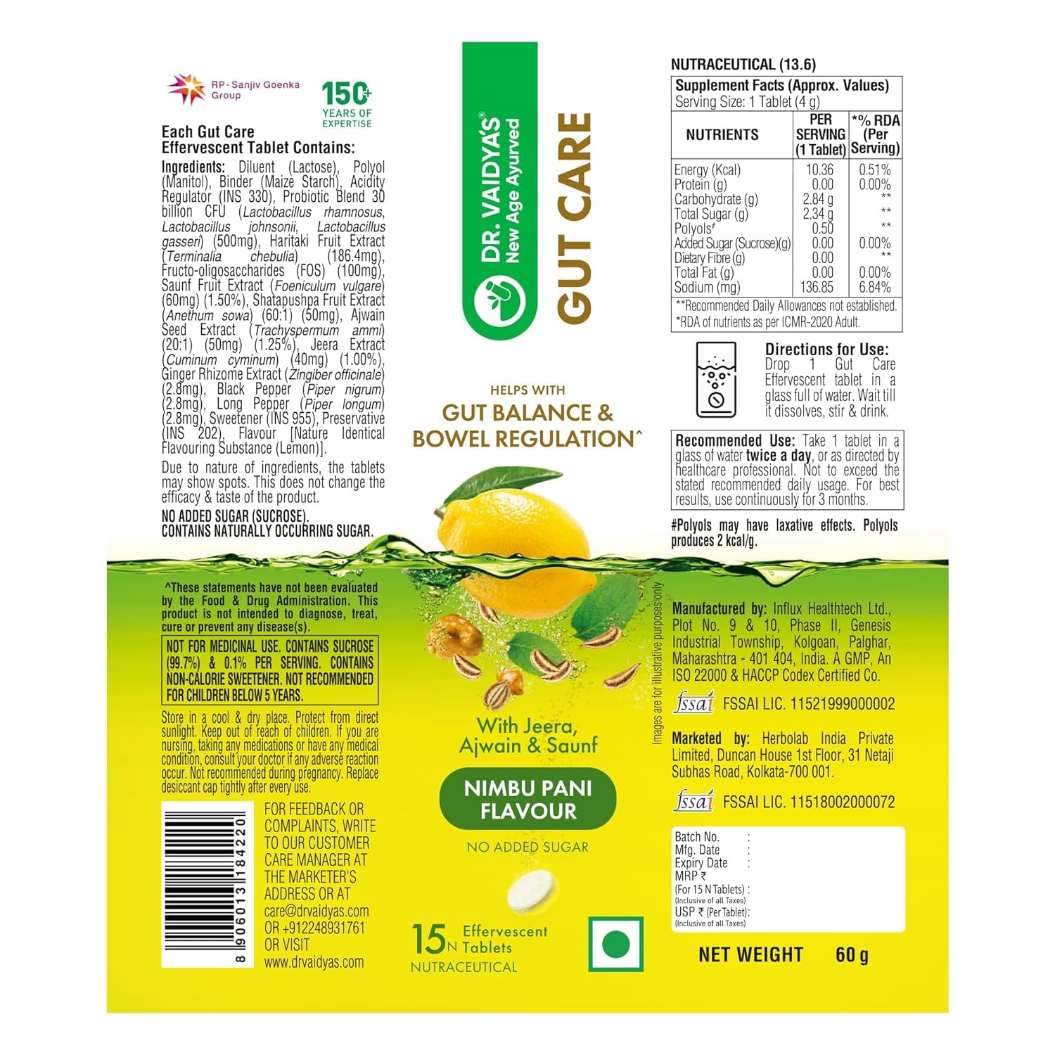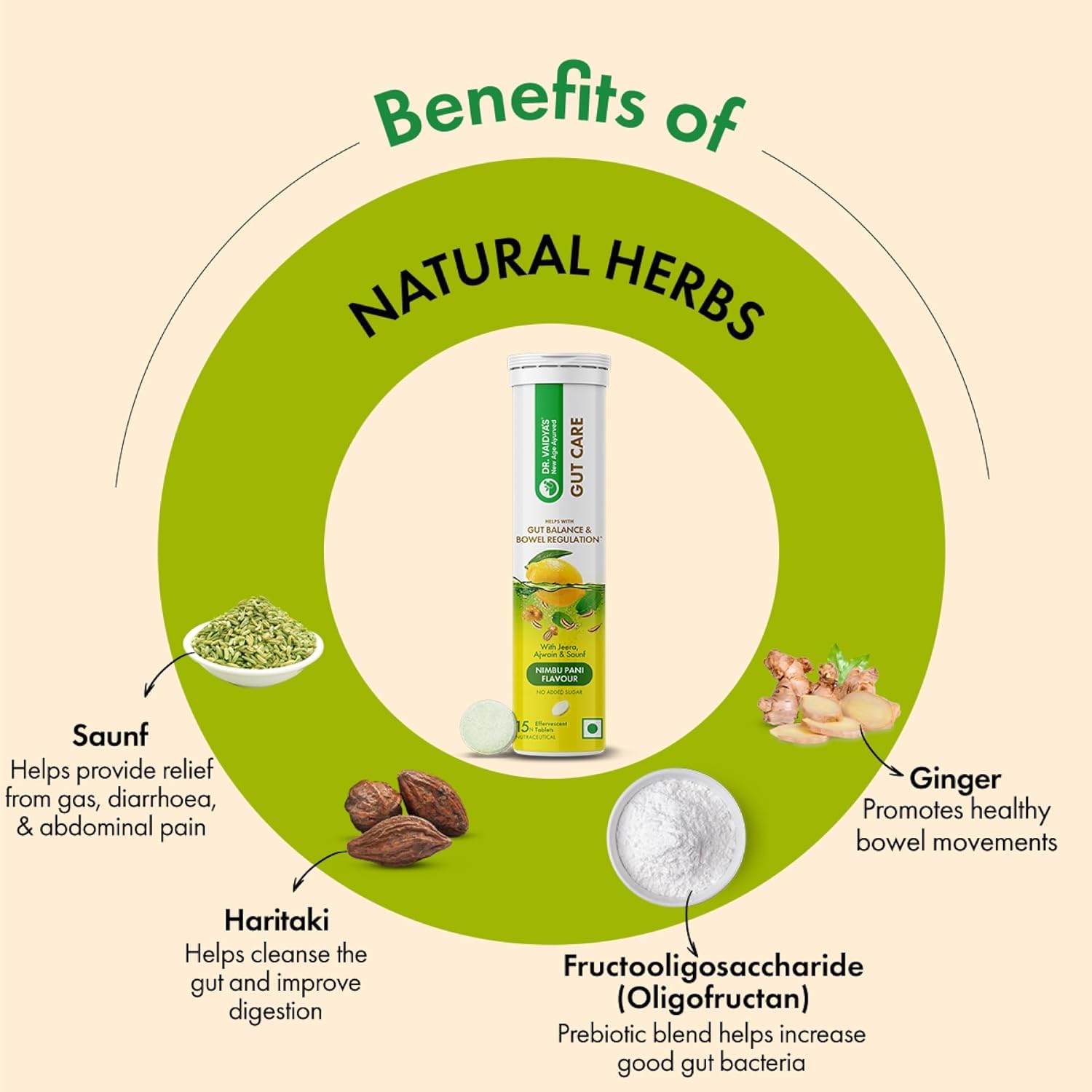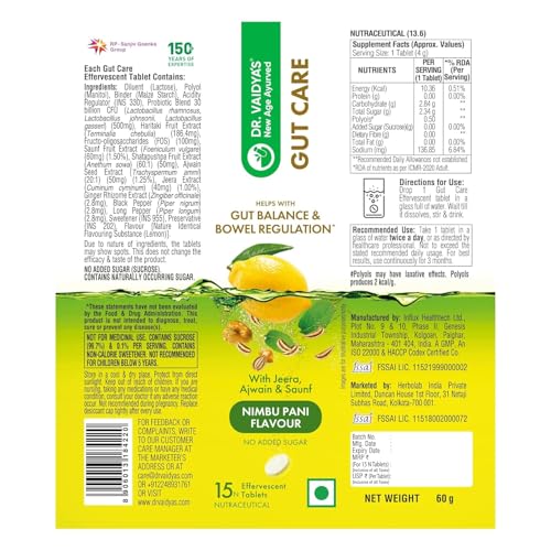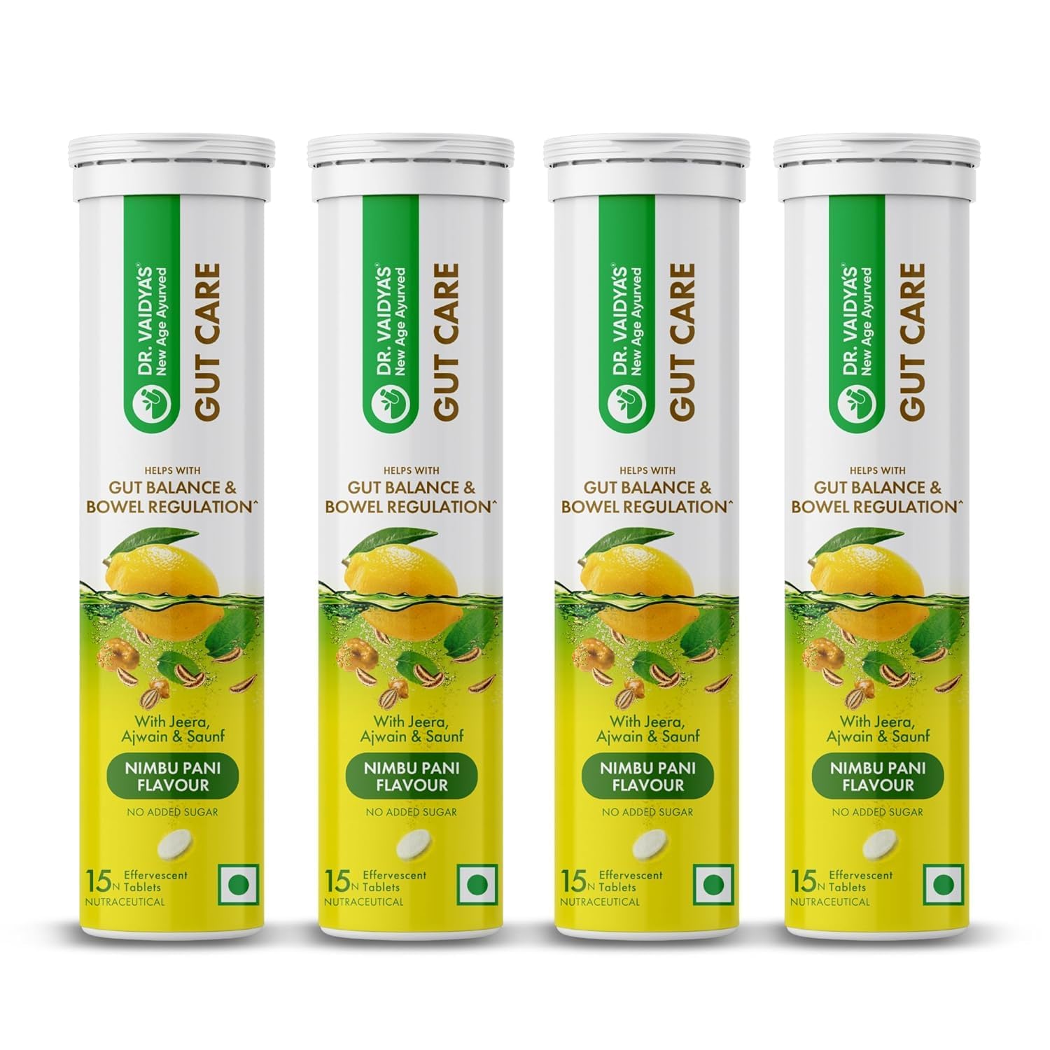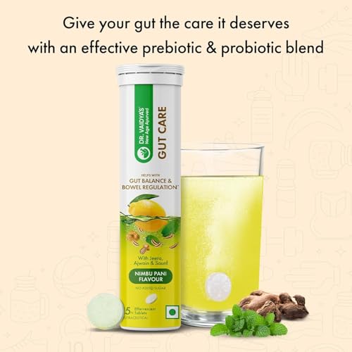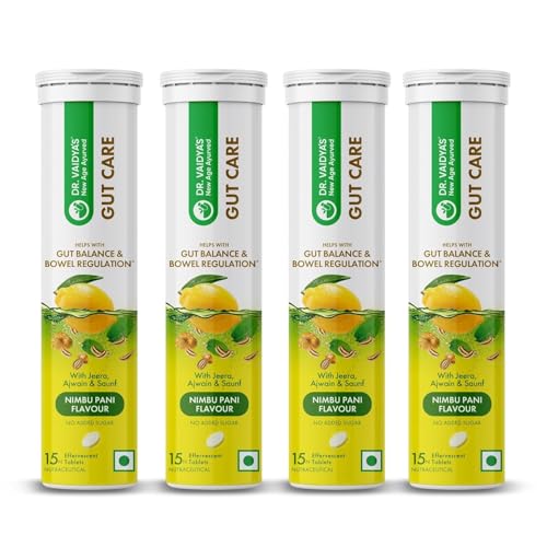 Dr. Vaidya's Gut Care Effervescent Tablets | Helps reduce bloating & acidity, improves digestion | Jeera, Ajwain, Saunf |Probiotic Blend with healthy gut microbiome 15 Tablets (Pack of 4)