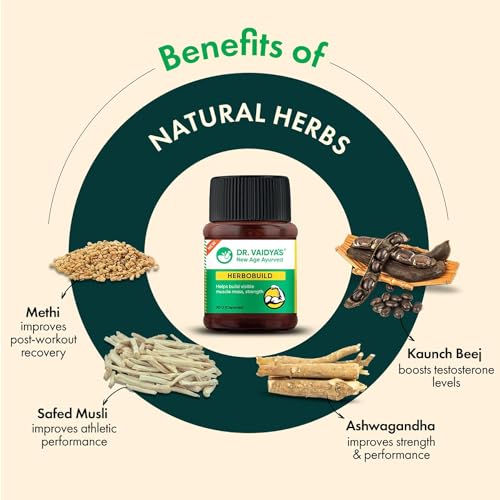 • REDUCES STRESS ANXIETY & FATIGUE: The ayurvedic ingredients present help reduce stress hormone -cortisol and prevent muscle depletion and body fatigue. Dr. Vaidya's Herbobuild capsules also reduce the mental and physical stress of intense workouts fatigue
