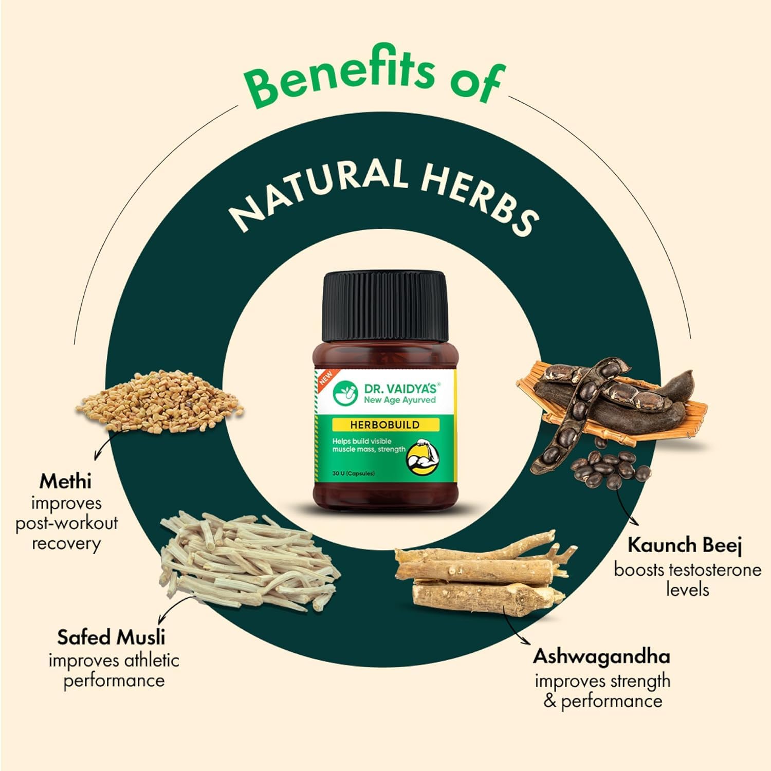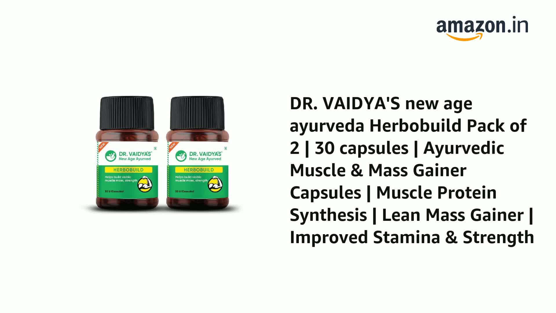 • AYURVEDIC SUPPLEMENT FOR NATURAL MUSCLE GROWTH: HerboBuild weight gainer capsules help you achieve your fitness goals without risking the side- effects associated with chemically synthesized products. Herbobuild ayurvedic capsules are a combination of nat