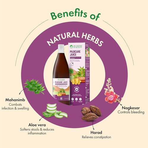 Looking for relief from piles pain swelling burning and itching? Discover Dr. Vaidya's Pilocare Juice: Your ultimate solution for piles relief. Expertly crafted with potent ingredients like Aloe vera Daruharidra and more it offers soothing and healing benefits. It also has other benefits like relieving constipation reducing pile mass regularising bowel movements & improving digestion. Pilocare Juice is free from heavy metals artificial colours & flavours and gluten. It is safe and effective with no known side effects. Power of Herbal Ingredients Aloe vera: Softens stools and enhances digestive health. Daruharidra: Helps in cleaning soothing and healing of wounds due to its antiseptic properties. Mahanimb: Analgesic anti-inflammatory and anti-microbial activities provide fast relief in pain and swelling of piles. Harad: Its laxative pain-relieving antimicrobial and wound-healing properties help get quick relief from pile symptoms promote healing and reduce pile mass size. Chitrak: This is one of the most powerful digestive herbs and also relieves pain in piles. Aragvadh: Possesses mild laxative anti-inflammatory and anti-microbial properties that benefit in relief from piles fissures and fistula. Mochrasa: Promotes wound healing Nagkesar: Controls bleeding Jeera: Improves digestion and reduces flatulence