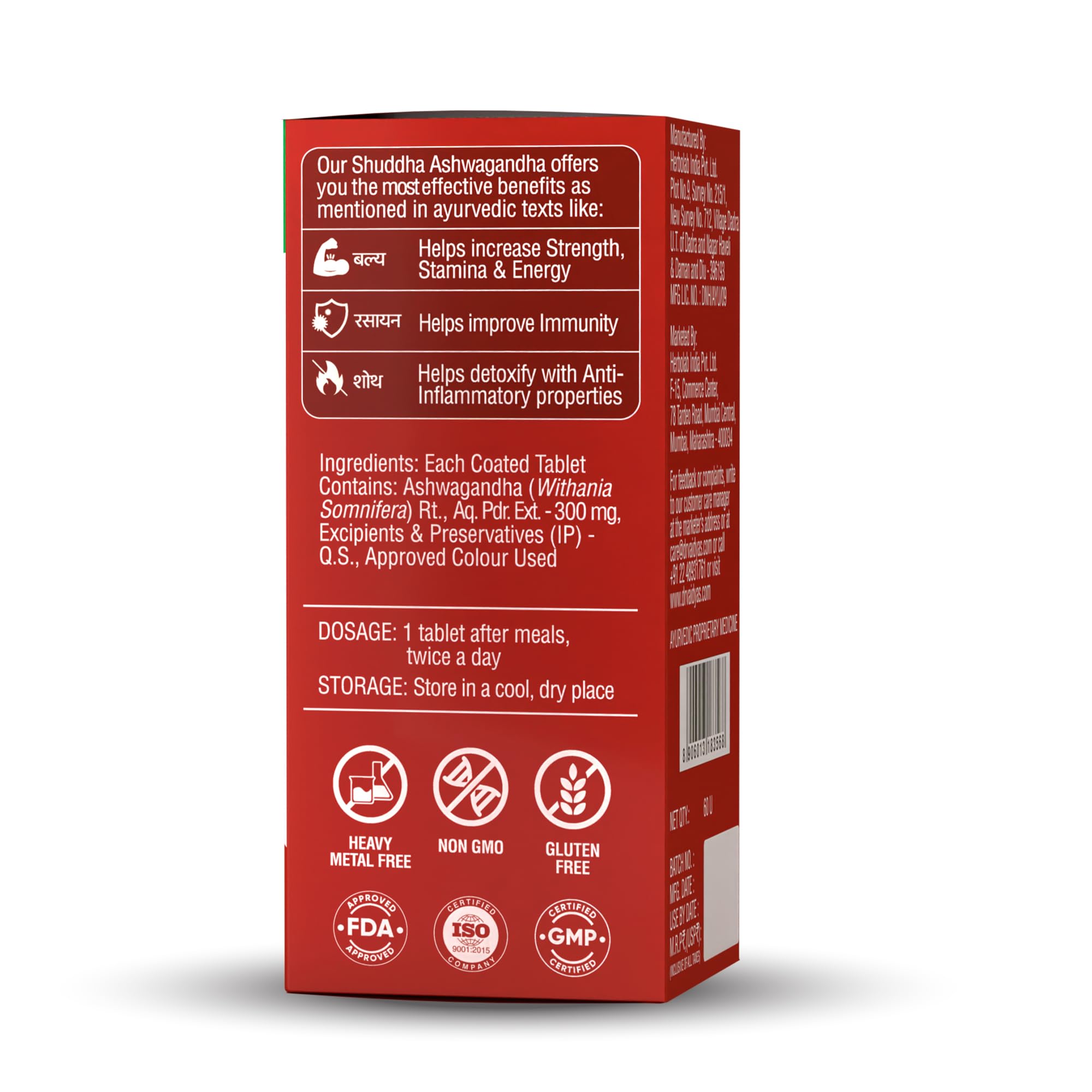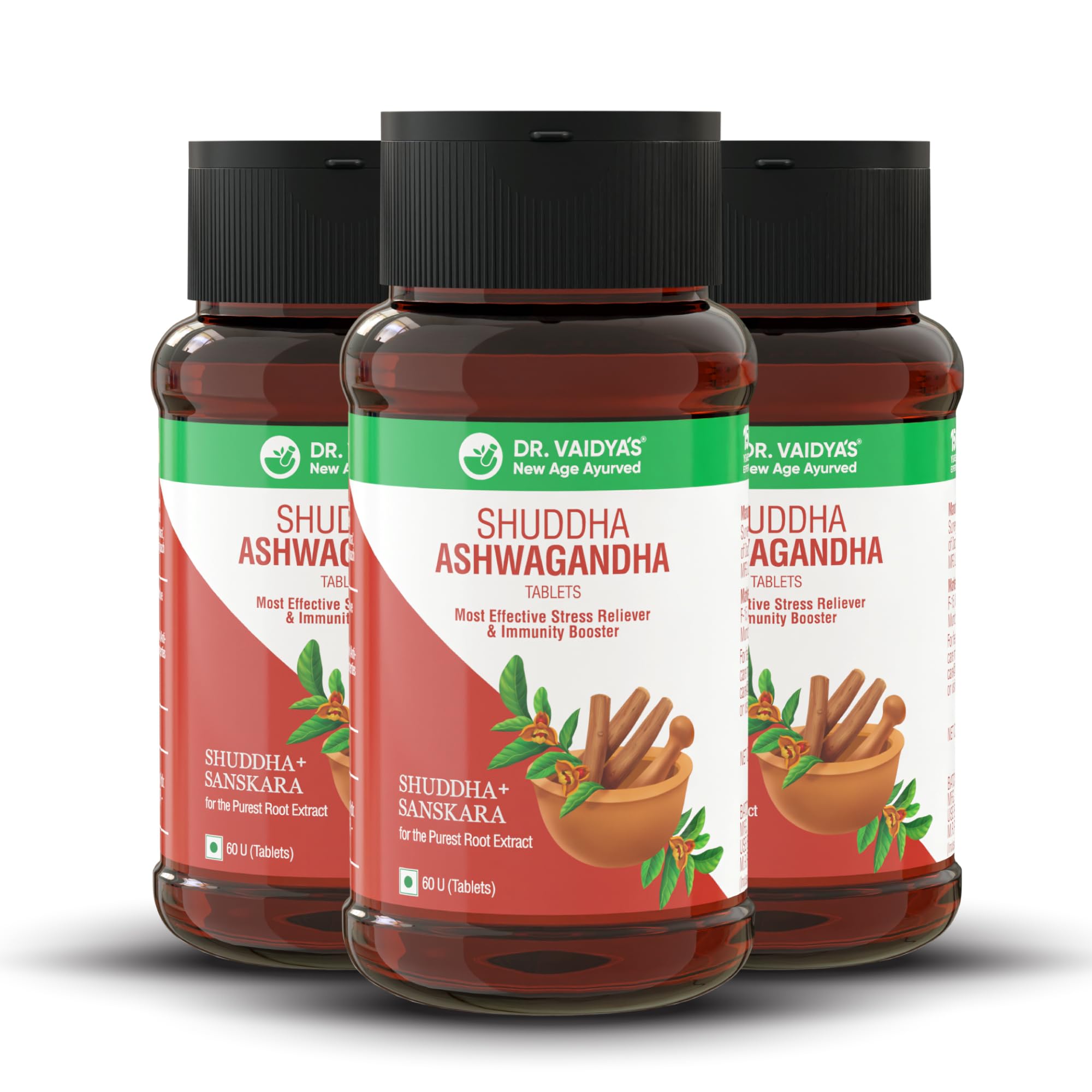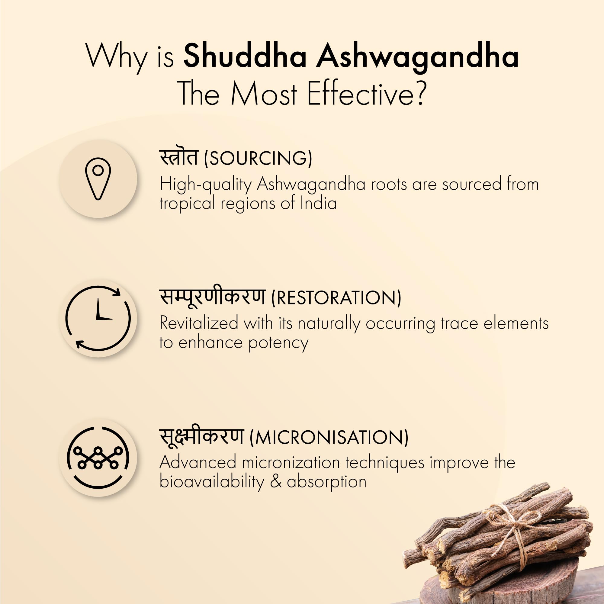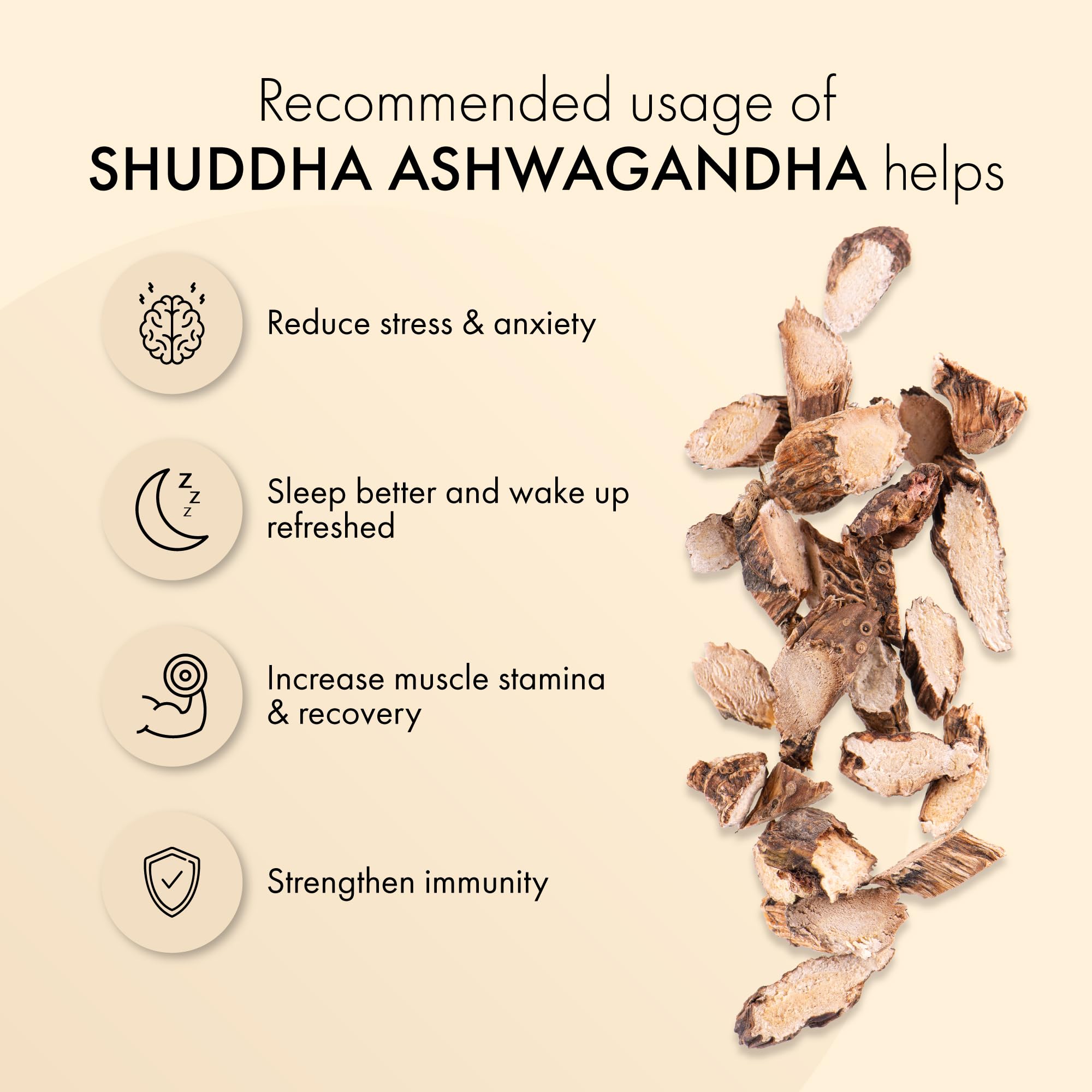 Experience the power of Shuddha Ashwagandha the most effective stress reliever and immunity booster that can unlock your inner well-being. Made with utmost care and precision our Shuddha Ashwagandha tablets are prepared through a unique 3-step Sanskara process ensuring maximum purity and potency. Discover the remarkable benefits of this time-tested herb and enhance your overall health and well-being.