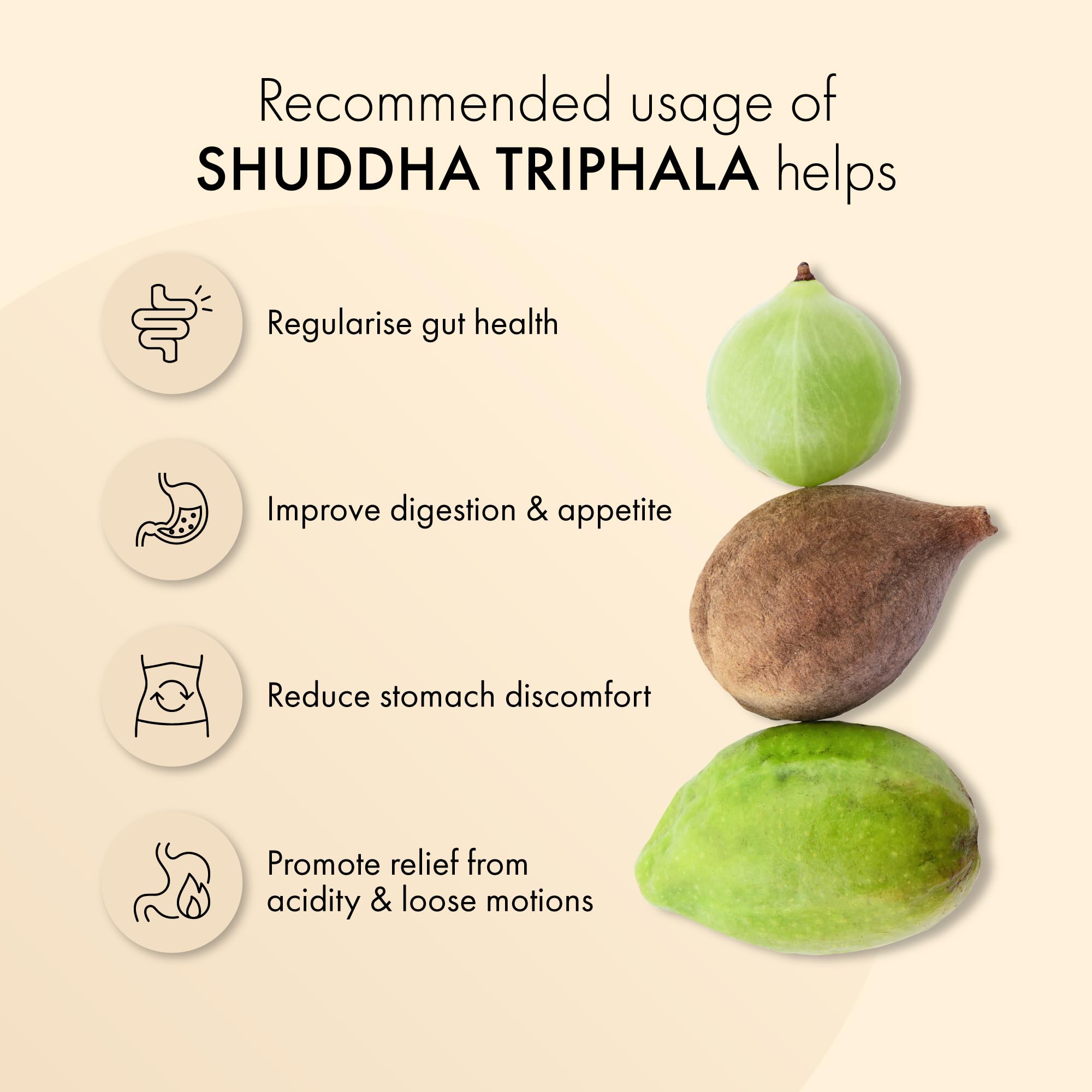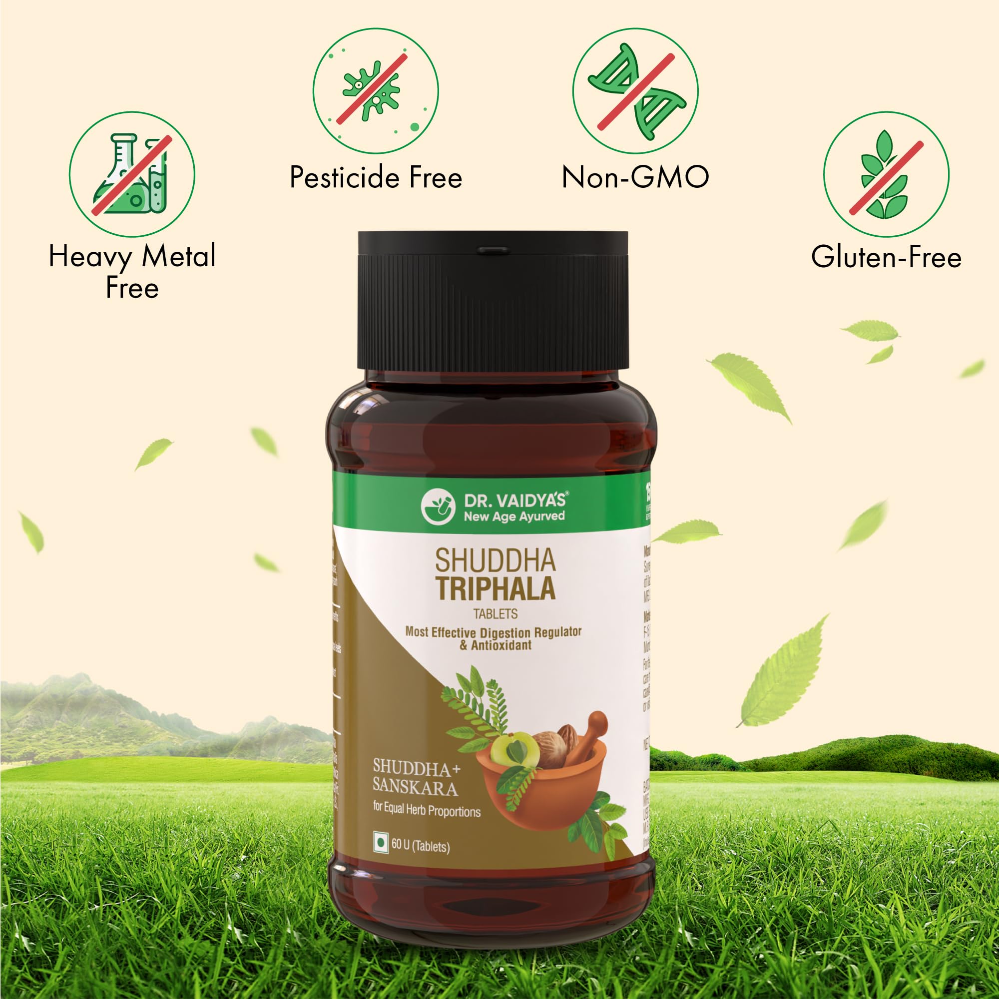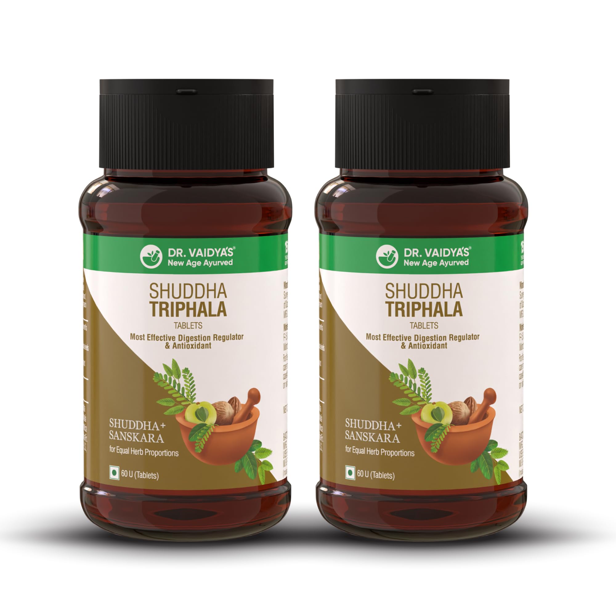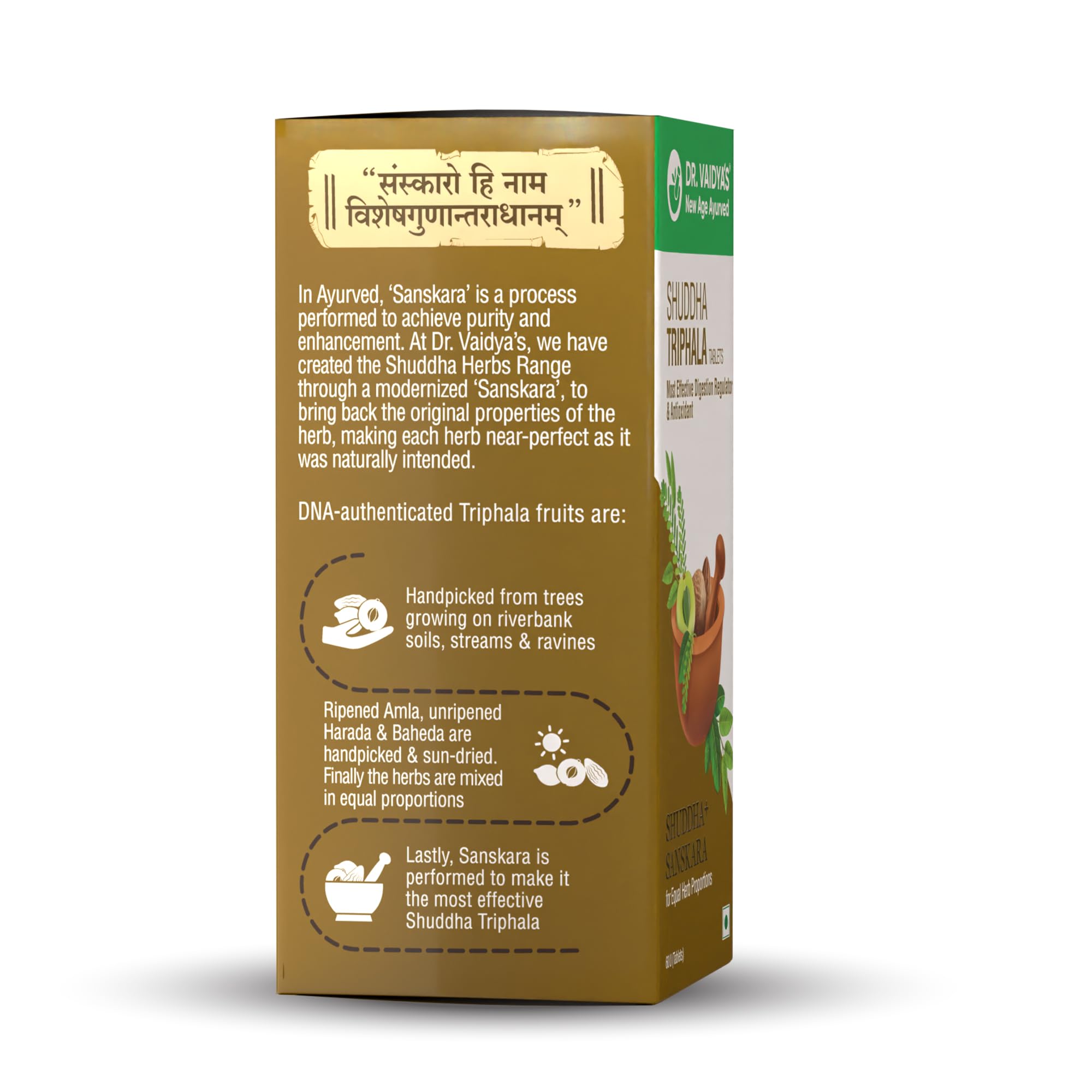 Experience the power of ancient Ayurvedic wisdom with DR. VAIDYA'S new age ayurveda Shuddha Triphala. Designed to be the most effective digestion regulator and antioxidant this remarkable herbal formulation will unlock a world of genuine inner well-being. With its unique 3-Step Sanskara process we ensure that you receive the purest Amla Harada and Beheda in equal proportions preserving their natural benefits and delivering them right to your doorstep.