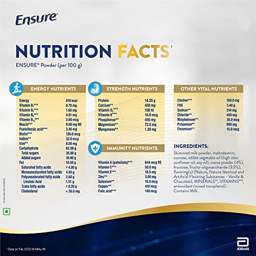 Ensure is a complete balanced nutrition supplement for adults. It has the perfect blend of 32 vital nutrients. It is scientifically designed for adults to help them keep strong healthy and support recovery. It contains high-quality proteins that help improve muscle strength & a balanced macronutrient ratio that supports optimum utilization of proteins. This product is scientifically formulated and clinically shown with 32 nutrients including protein calcium Vitamin D that could be missing from your diet. This specialized nutritional drink is available in chocolate and vanilla flavour and comes in 200gm 400gm 1kg and 2kg sizes.