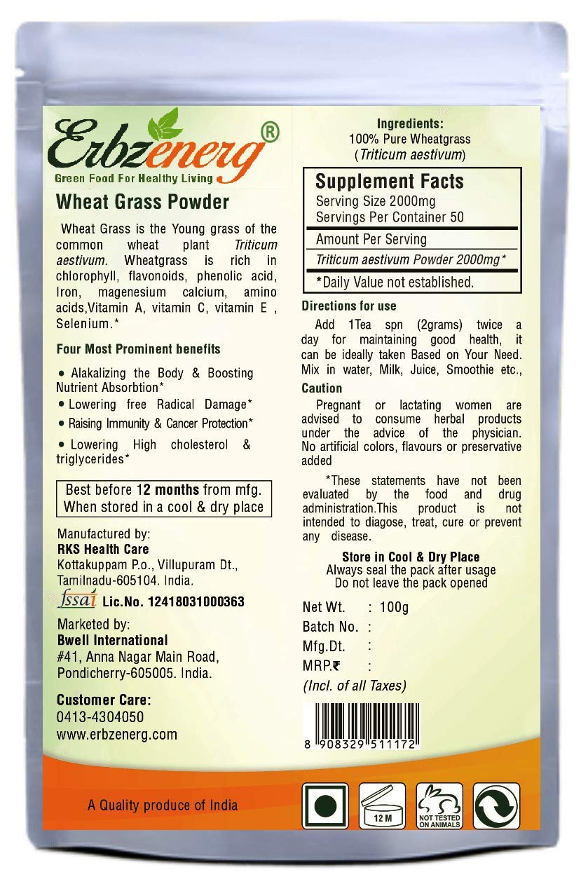 Wheat Grass Powder is an energy and immunity booster supplement. It contains Vitamin A C K E B1 B2 B3 B6 B12 Folic acid Calcium Iron and Chlorophyll. All these nutrients are available in their natural forms and Naturally Acceptable to the Body. Improves immunity It has high in iron and improves Sleep.