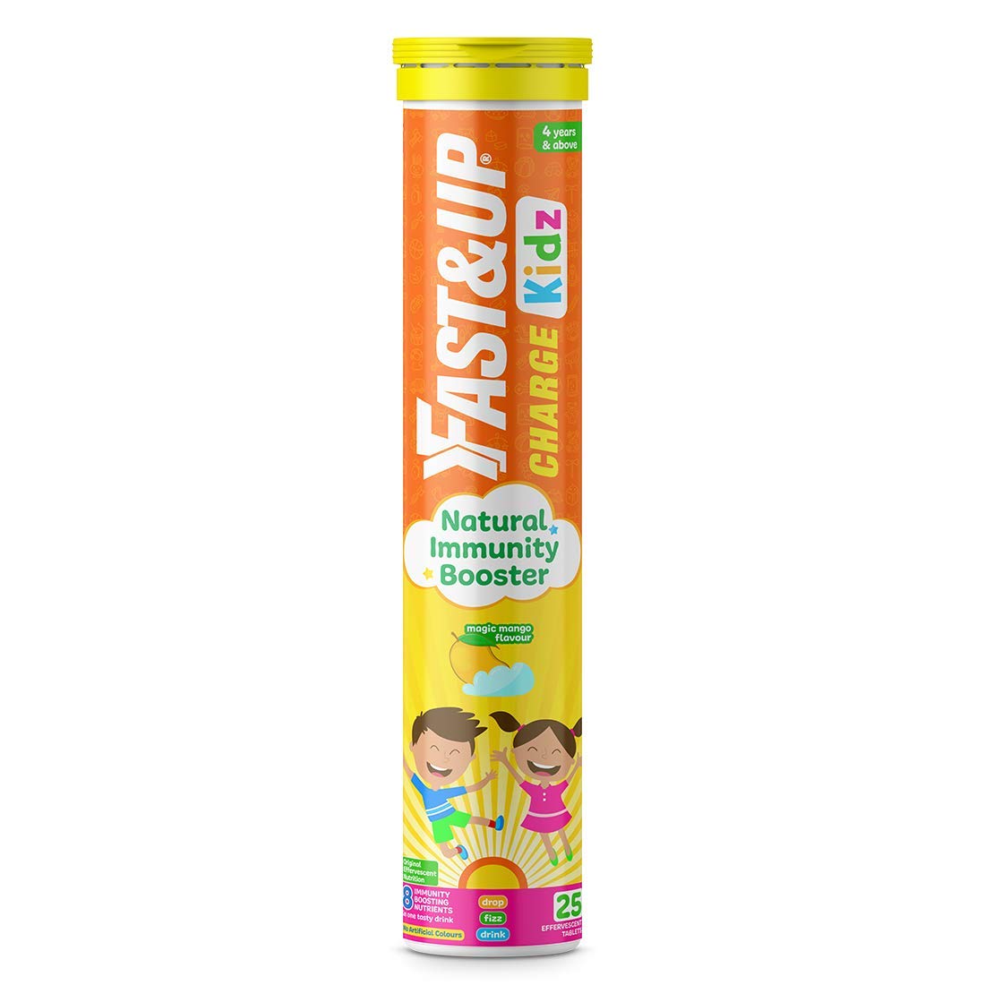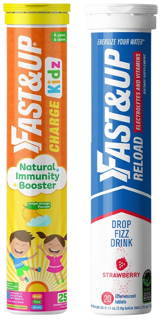 Fast&Up Charge Kids - Daily Immunity Essential Multivitamin for Kids - Zinc Vitamin C D3 & B6 with Turmeric Ginger & Tulsi Extracts (25 Effervescent Tablets Mango Flavor)Fast&Up Charge Kids designed with 8 Natural Immunity Boosting Nutrients in one tasty drink helps to protect strengthen and build daily immunity. Formulated with three intelligent well - researched and scientifically backed complexes like Active Vitamin C Complex Super Immunity Herbs and Pro Immunity Vitamins & Minerals helps to provide daily natural immunity and promote general well - being. Active Vitamin C Complex comprises 140mg Natural Amla Extract and 40mg Vitamin C. Amla Extract is a well-known and rich source of Vitamin C along with natural bioflavonoids and antioxidants. Vitamin C helps to protect against harmful pathogens bioflavonoids present in Natural Amla extract helps to enhance antioxidant properties of Vitamin C. Super Immunity Herb with Turmeric Extract Tulsi Extract and Ginger helps to strengthen the body's defense system to fight germs. Formulated with all-natural high-quality and scientifically-backed herbs it helps to strengthen and maintain the immune system and helps to enhance immune response to harmful pathogens. Alongside Active Vitamin C Complex and Super Immunity Herbs Fast&Up Charge Kids also provides 100% RDA of Vitamin D3 Zinc & Vitamin B6 with Pro Immunity Vitamins & Minerals to build a stronger immune system. Each Charge Kids tablet formulated with premium Swiss effervescent technology and recommended by experts helps to provide faster nutrient absorption with higher bioavailability as compared to normal supplements in Magic Mango flavour with no added sugar. With Original Effervescent Nutrition Fast&Up Charge Kids it is easy to consume just drop 1 tablet in 250ml water wait till it dissolves completely and have it after a meal & charge your immunity.Fast&Up Reload electrolyte energy and hydration drink - 20 effervescent tablets - Berry flavourFast&Up is India's first effervescent nutrition brand to keep you active. Fast&Up Reload is a hypotonic hydration drink with the ideal combination of Electrolytes Vitamins Minerals and Antioxidants to rehydrate and maintain electrolyte balance during the workout and your everyday active lifestyle. It is India's first Informed choice electrolyte drink. Fast&Up Reload supplement is available in effervescent tablet form which helps you to replenish electrolytes without any digestive issues. With its unique formulation this electrolyte sports drink ensures instant hydration. Because of its hypotonic nature Reload increases the rate at which water is absorbed by the body and speeds up the rehydration process. Evidence suggests that a hypotonic sports drink provides minimally to moderately faster fluid absorption than more concentrated isotonic-hypertonic sports drinks. Fast&Up Reload contains Calcium and Magnesium along with electrolytes to help prevent cramps. Vitamin C in this sports electrolyte drink helps reduce muscle soreness and fatigue. This easy to carry electrolyte drink understands the serious needs of hydration and is uniquely formulated without any overloading of sugar. Fast&Up Reload can be consumed by anyone during workout or anytime during the day by someone who leads an active life to help fight exhaustion. Maximum Shelf Life : 18 Months