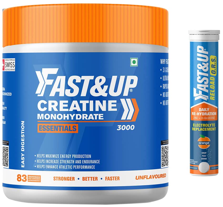 Fast&Up Creatine Monohydrate (250 gms 83 Servings) Helps Sustain Longer Workout Muscle Repair & Recovery - UnflavoredCreatine Monohydrate is one of the most common nutritional supplements among the bodybuilding and boxing community along with people who are into intense physical activity. Creatine Monohydrate serves as a powerhouse of energy as it helps to fuel energy during intense workouts or activities provides sustained energy helps fulfil Creatine requirements helps build and maintain muscle mass strength and endurance. ATP (Adenosine Triphosphate) is the energy fuel for energy. When you work-out or perform heavy activities ATP is converted to ADP (Adenosine Diphosphate) to source energy Creatine helps to recharge ADP and converts it to ATP by donating Phosphate and contributes to provide instant energy. Creatine does this by converting it to Creatine Phosphate once inside the body. Creatine when added to regular workout helps to build muscle mass with its anti -catabolic properties. It promotes muscle growth and aids in muscle repair and new muscle growth as well. Creatine Monohydrate also increases cell hydration as it lifts water content in the muscles thereby plays a key role in muscle growth. Fast&Up Creatine Monohydrate is formulated with high quality pure banned substance free with no artificial colours or additives. It is Ultra Micronized to provide faster absorption in the body and is easy to digest. It is recommended by Elite Athletes and Experts to boost energy levels muscle strength and endurance and to enhance athletic performance. Each 3g scoop of Fast&Up Creatine Monohydrate can be consumed daily with 300ml water or any healthy beverage of choice shake well to dissolve completely and drink. It can be consumed by anyone who is into bodybuilding Boxing activities that involve physical exertion and athletes into intense sports. Creatine can be consumed on resting days as well as it helps to build Creatine stores in the muscle that helps during any intense activity to fuel energy and sustain the activity without hitting the wall.FAST&UP Reload O.R.S Effervescent Electrolyte Tablets for Daily Rehydration Orange Flavour - 20 Effervescent Tablets BlueManage your dehydration & restore the fluid loss in your body with Fast&Up Reload O.R.S. - a high-quality Effervescent Electrolyte Tablets having a well - researched formulation. Fast&Up Reload O.R.S with clinical electrolyte help to replenish the electrolytes & fluids that we lose resulting from workout & physical activity headache excess loss of fluids through â fever diarrhoea and vomiting hangover headache and dehydration. Its chief component Zinc â helps to reduce duration and severity of fluid loss by improving absorption of water and electrolytes and D-Glucose helps to enhance absorption of Sodium which helps to drag water into intestinal cells and the body. Other vital electrolytes such as Potassium & Magnesium helps to avoid frequent episodes of dehydration and prevent fluid loss. Sodium & Chlorides help promote rapid rehydration & replacement of salts while regulating the fluid & electrolyte balance. Fast&Up Reload O.R.S is formulated with premium Swiss effervescent technology and is more effective than other ORS supplements in the market that may cause bloating and interfere with the hydration process. It is an ideal choice for those that follow a physically active lifestyle fall sick frequently wish to remain healthy & fit or are traveling or suffer from conditions that lead to electrolyte imbalance and fluid loss from the body. When suffering from conditions that result in fluid loss and electrolyte imbalance consuming Reload O.R.S can help you overcome the dehydration rapidly & effectively. It is the perfect balance of electrolytes that hydrates the body faster than water alone. Fast&Up Reload O.R.S offers a refreshing orange flavor & is a compact easy to carry tube comprising 20 Effervescent Tablets formulated with advanced Swiss Effervescent Technology that promotes faster absorption instant action and higher nutrient bioavailability.