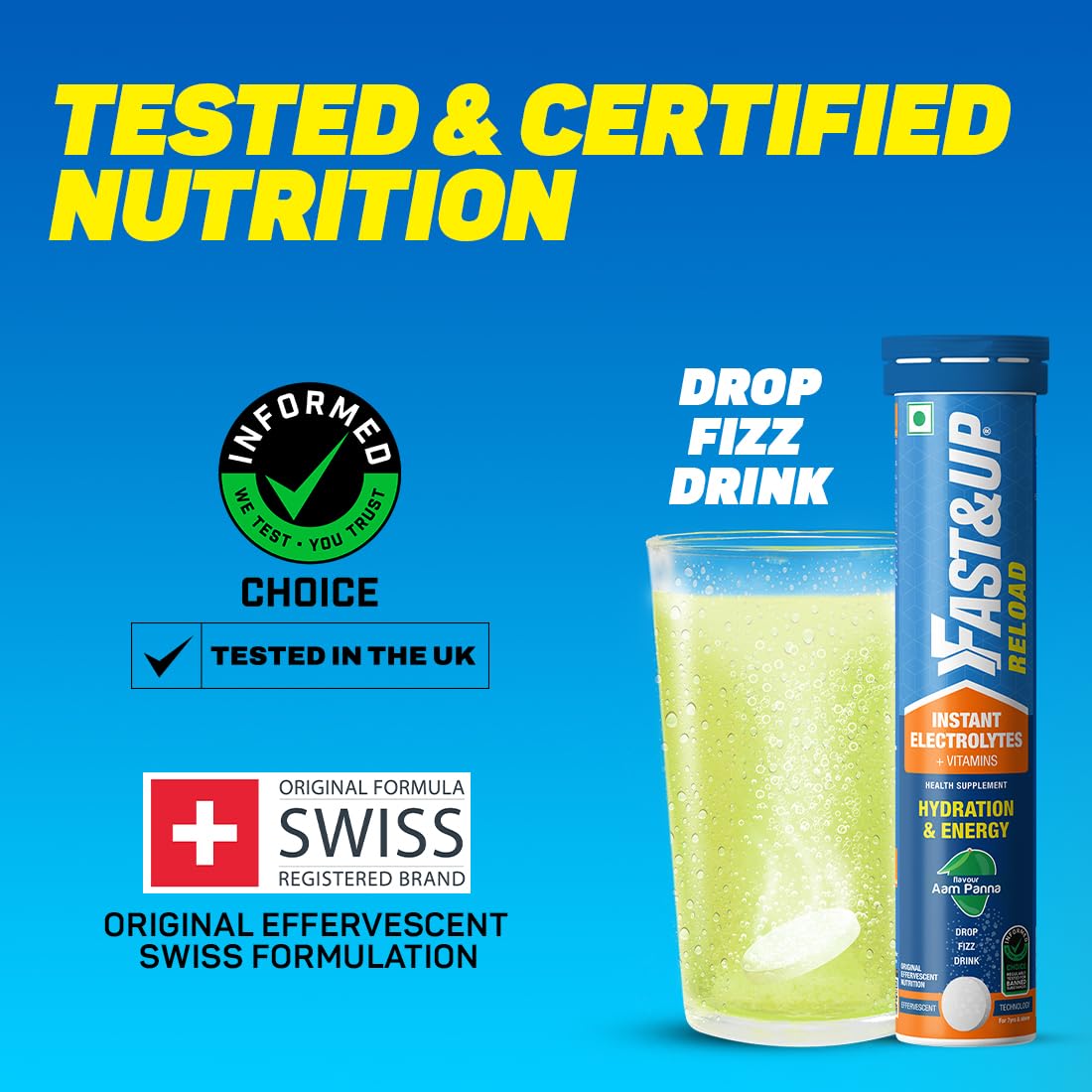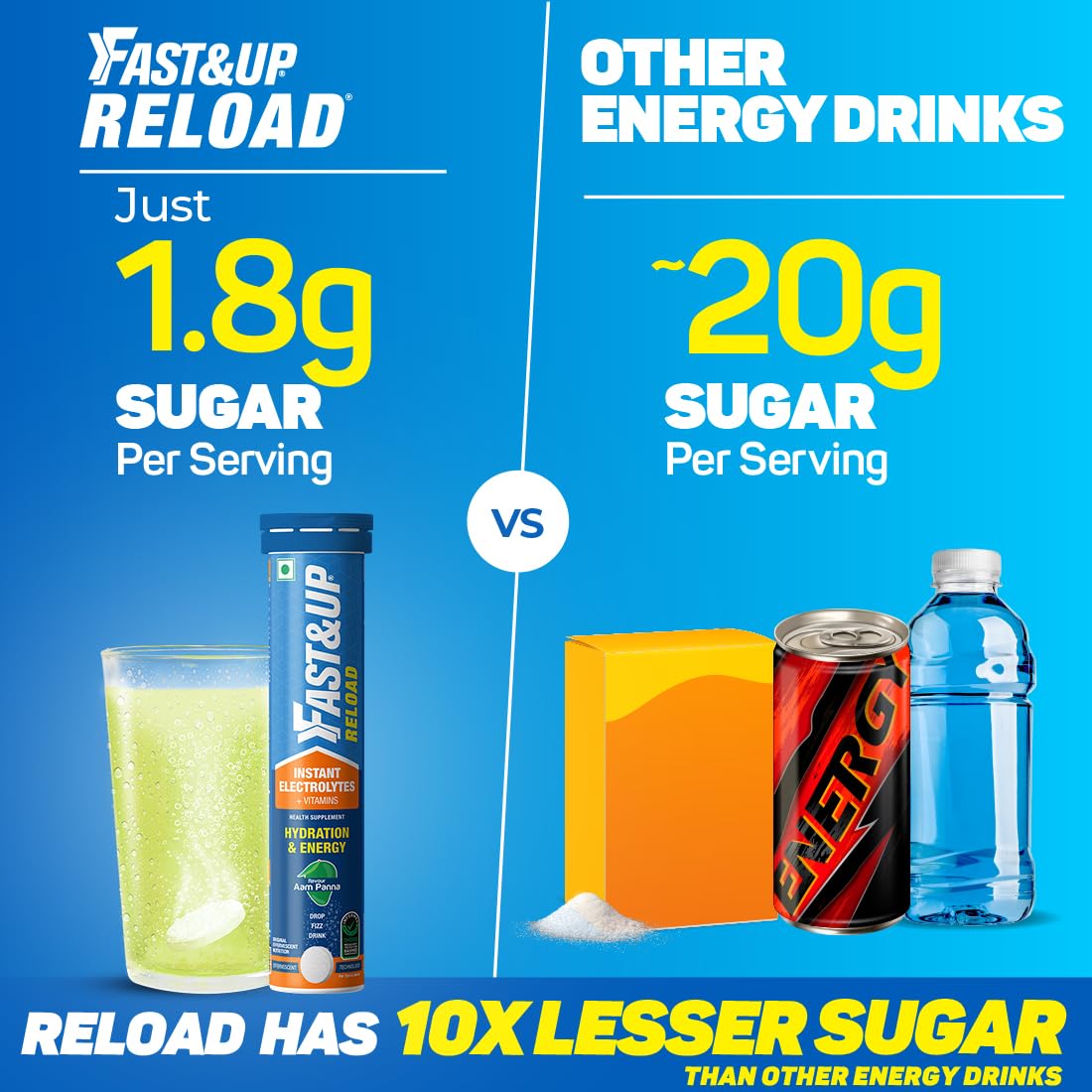 Fast&Up Reload (5 Litres) Low Sugar energy drink for Instant Hydration - 20 Effervescent Tablets with all 5 Essential Electrolytes + Added Vitamins - Certified Electrolytes Drink - Aam Panna flavour