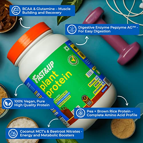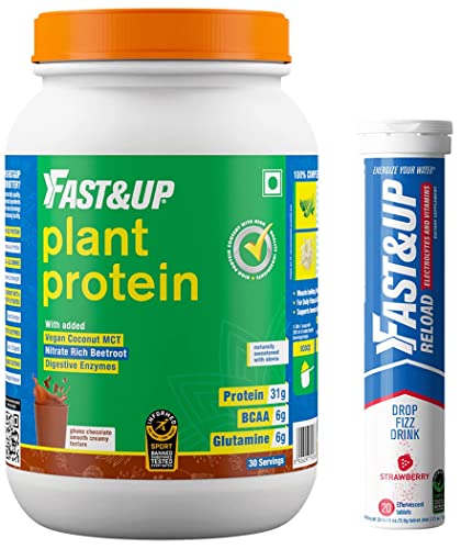 Fast&Up Vegan Plant Protein (31g Protein â Pea isolate & Brown Rice protein blend For Strength Recovery & Energy Boost For Everyday Fitness & Nutrition (1.41 kg 3.10 Lbs - Chocolate Flavor).Packed with Plant Power Fast& Up Plant Protein Isolate is scientifically formulated with a blend of plant protein sourced from Yellow Peas and Brown Rice; that wins on its Quality best in industry taste smell and the highest protein content compared to most of the protein supplements in the market. The very purpose of protein supplements is to help fulfil the requirements missing from the diet and enhance performance. 34g high plant protein isolate enables you to achieve the same with complete amino acid profile and maximum absorption. This pure vegan protein contains naturally occurring 5.8 g BCAA 5.5 g Glutamine along with added Vegan Coconut MCTâs and Beetroot extract for Energy. Added Vegan Coconut MCTâs boost energy metabolism promotes fat loss and helps build lean muscle. Made with Quality ingredients and no artificial sweetener this vegan protein has no bitter taste unpleasant smell and does not cause bloating or stomach upsets. Enjoy each scoop (45g) of this Quality and best tasting 100% Vegan Protein Isolate in 500 ml of water or your favourite smoothie shake and drink. Available in classic and premium Ghana chocolate flavour with smooth creamy texture for post workout muscle recovery muscle building and strength and for general well-being.Fast&Up Reload electrolyte energy and hydration drink - 20 effervescent tablets - Berry flavourFast&Up is India's first effervescent nutrition brand to keep you active. Fast&Up Reload is a hypotonic hydration drink with the ideal combination of Electrolytes Vitamins Minerals and Antioxidants to rehydrate and maintain electrolyte balance during the workout and your everyday active lifestyle. It is India's first Informed choice electrolyte drink. Fast&Up Reload supplement is available in effervescent tablet form which helps you to replenish electrolytes without any digestive issues. With its unique formulation this electrolyte sports drink ensures instant hydration. Because of its hypotonic nature Reload increases the rate at which water is absorbed by the body and speeds up the rehydration process. Evidence suggests that a hypotonic sports drink provides minimally to moderately faster fluid absorption than more concentrated isotonic-hypertonic sports drinks. Fast&Up Reload contains Calcium and Magnesium along with electrolytes to help prevent cramps. Vitamin C in this sports electrolyte drink helps reduce muscle soreness and fatigue. This easy to carry electrolyte drink understands the serious needs of hydration and is uniquely formulated without any overloading of sugar. Fast&Up Reload can be consumed by anyone during workout or anytime during the day by someone who leads an active life to help fight exhaustion. Maximum Shelf Life : 18 Months