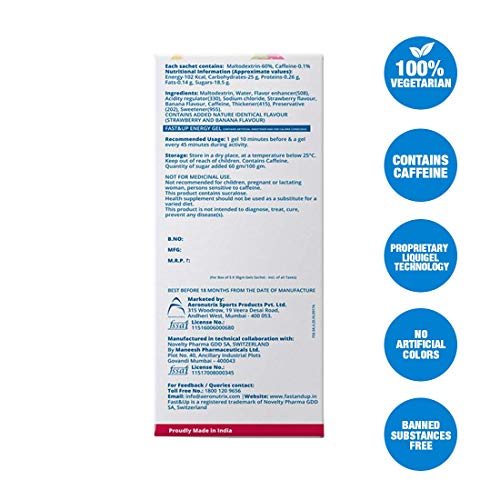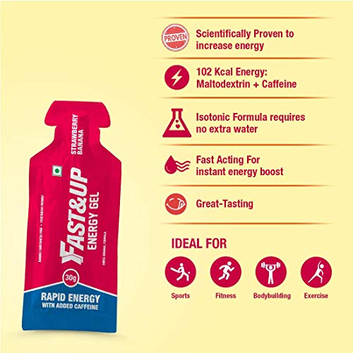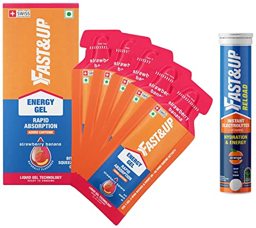 Fast&Up Energy Gel - Instant Energy - Nutrition Supplement - 30g Carbs With Maltodextrin - Vegan - Pack of 5 Gels - Strawberry Banana FlavourFast&Up Energy Gel is a carbohydrate based energy gel formulated with a blend of 60 percent maltodextrin and 0.1 percent caffeine which is easy to open and sip during your game. Packed with 102 kcal of instant energy in a single serving gel sachet Energy Gel provides instant energy boost with maltodextrin a carbohydrate that's more quickly absorbed than other carbohydrates. This strawberry banana flavoured energy gel contains caffeine to keep you alert and improve your focus during your game. Formulated using proprietary technology Fast&Up Energy Gel is easily absorbed and digested without any stomach upset. There is no need for any extra preparation of water all you need to do is just bite squeeze and sip. It is easy-to-carry highly-effective and provides you with instant energy that digests easier than any other sports energy gel. The result is fast acting and long-lasting energy with peak performance without any gastrointestinal discomfort. This high performance energy gel with tasty flavour is a great choice if you want to enhance your endurance performance and prolong your energy levels.Fast&Up Reload electrolyte energy and hydration - sports drink - 20 effervescent tablets - Orange flavourFast&Up is India's first effervescent nutrition brand to keep you active. Fast&Up Reload is a hypotonic hydration drink with the ideal combination of Electrolytes Vitamins Minerals and Antioxidants to rehydrate and maintain electrolyte balance during the workout and your everyday active lifestyle. It is India's first Informed choice electrolyte drink. Fast&Up Reload supplement is available in effervescent tablet form which helps you to replenish electrolytes without any digestive issues. With its unique formulation this electrolyte sports drink ensures instant hydration. Because of its hypotonic nature Reload increases the rate at which water is absorbed by the body and speeds up the rehydration process. Evidence suggests that a hypotonic sports drink provides minimally to moderately faster fluid absorption than more concentrated isotonic-hypertonic sports drinks. Fast&Up Reload contains Calcium and Magnesium along with electrolytes to help prevent cramps. Vitamin C in this sports electrolyte drink helps reduce muscle soreness and fatigue. This easy to carry electrolyte drink understands the serious needs of hydration and is uniquely formulated without any overloading of sugar. Fast&Up Reload can be consumed by anyone during workout or anytime during the day by someone who leads an active life to help fight exhaustion