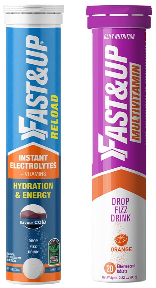 Fast&Up Vitalize - Immunity Essential Multivitamin For Men & Women (20 Effervescent Tablets - Orange Flavor) - 21 Vital Vitamins & Minerals with Vitamin C D & Zinc For Daily Health & ImmunityFast and Up Vitalize is an effervescent daily multivitamin supplement with a combination of 12 vitamins 9 minerals and a natural nitrate rich beetroot extract for overall health and maintenance. This daily multivitamin supplement is made with effervescent technology which provides faster absorption greater effectiveness and significant nutritional benefit better than any other conventional and traditional form of multivitamin supplementation. Specifically made to provide the daily nutrient support Fast and Up Vitalize daily multivitamins help bridge the nutritional gap lacking in todayâs food and diet practices. This daily multivitamin drink is a perfect supplement to provide with an optimal supply of the daily vitamins and minerals as without which our energy levels can drop; it can make us feel sick or tired leading to a serious deficiency if avoided for a longer period of time. With the goodness of daily multivitamins. Note: Product outer packaging may vary as per stock availabilityFast&Up Reload electrolyte instant energy and hydration drink - 20 effervescent tablets - Cola flavourFast&Up is India's first effervescent nutrition brand to keep you active. Fast&Up Reload is a hypotonic hydration drink with the ideal combination of Electrolytes Vitamins Minerals and Antioxidants to rehydrate and maintain electrolyte balance during the workout and your everyday active lifestyle. It is India's first Informed choice electrolyte drink. Fast&Up Reload supplement is available in effervescent tablet form which helps you to replenish electrolytes without any digestive issues. With its unique formulation this electrolyte sports drink ensures instant hydration. Because of its hypotonic nature Reload increases the rate at which water is absorbed by the body and speeds up the rehydration process. Evidence suggests that a hypotonic sports drink provides minimally to moderately faster fluid absorption than more concentrated isotonic-hypertonic sports drinks. Fast&Up Reload contains Calcium and Magnesium along with electrolytes to help prevent cramps. Vitamin C in this sports electrolyte drink helps reduce muscle soreness and fatigue. This easy to carry electrolyte drink understands the serious needs of hydration and is uniquely formulated without any overloading of sugar. Fast&Up Reload can be consumed by anyone during workout or anytime during the day by someone who leads an active life to help fight exhaustion