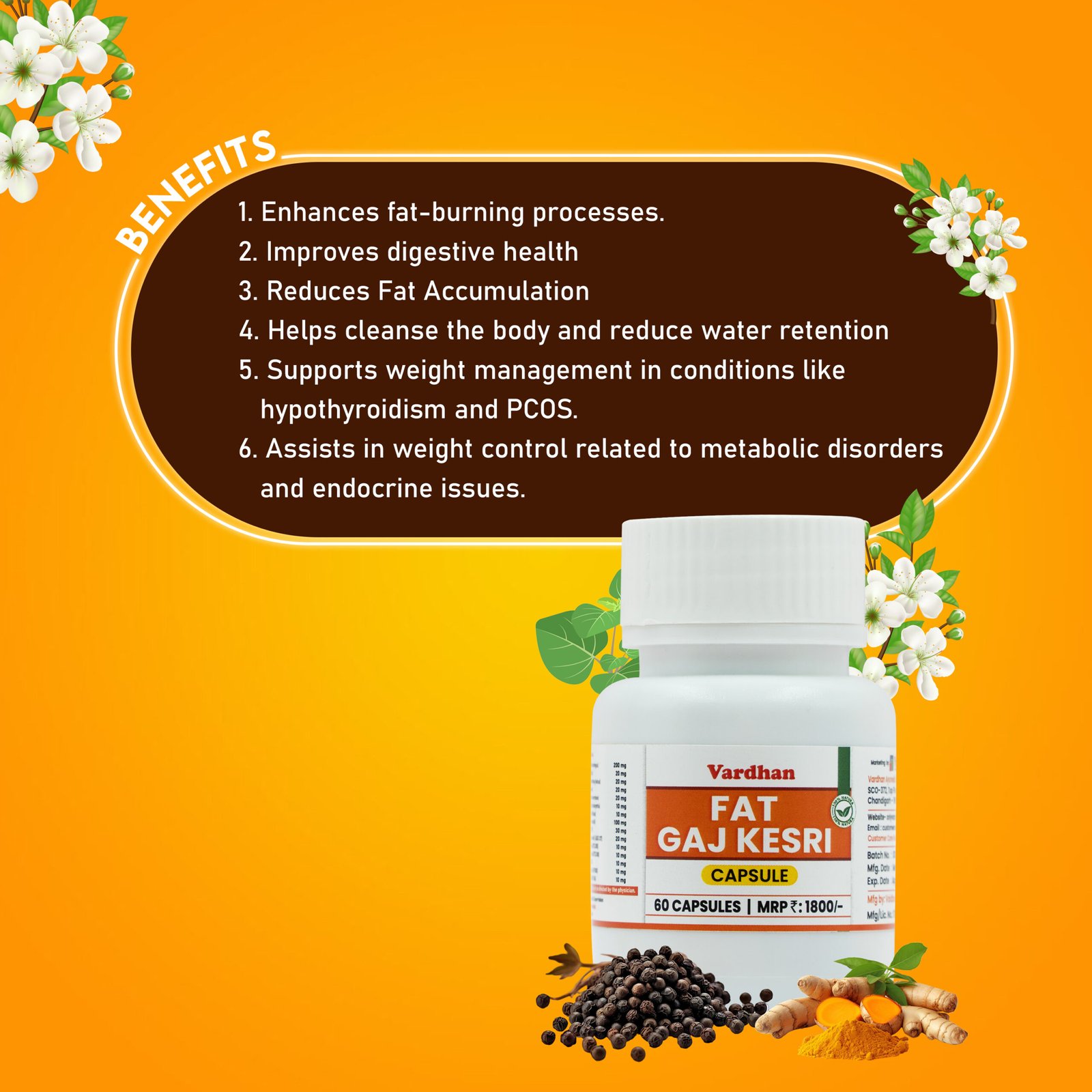 Fat Gaj Kesri is a carefully formulated blend designed to support weight loss and manage obesity. It contains 15 natural herbs and minerals, known for their health benefits and effectiveness in aiding weight management.
