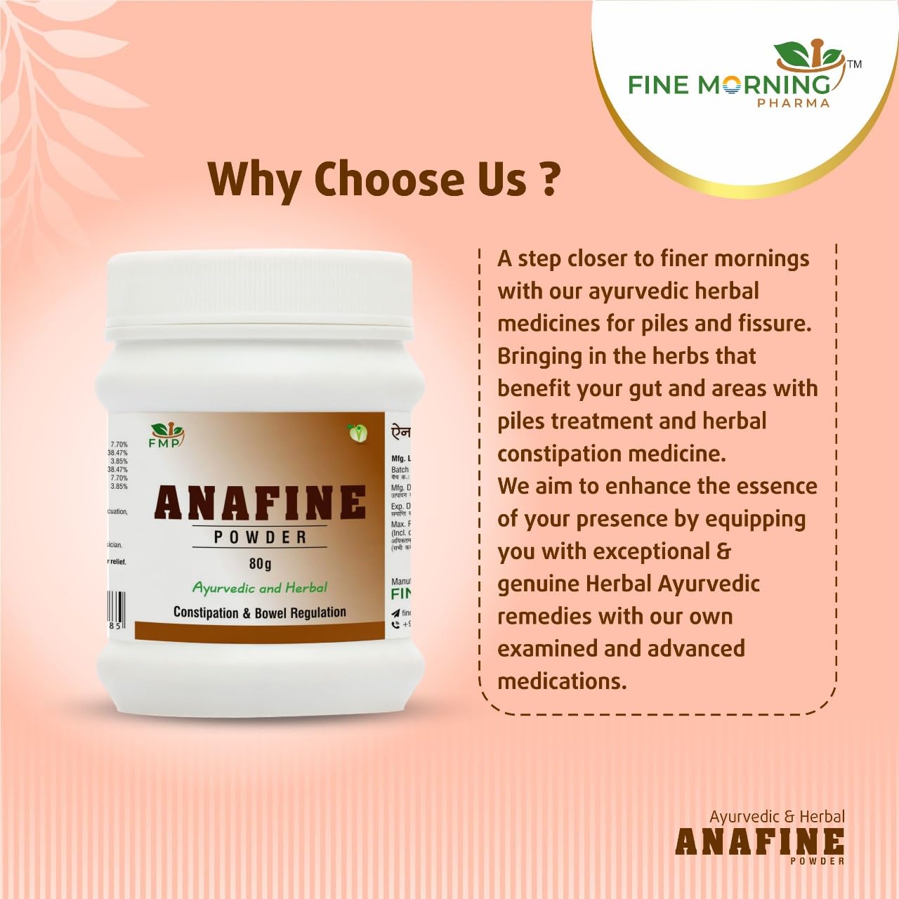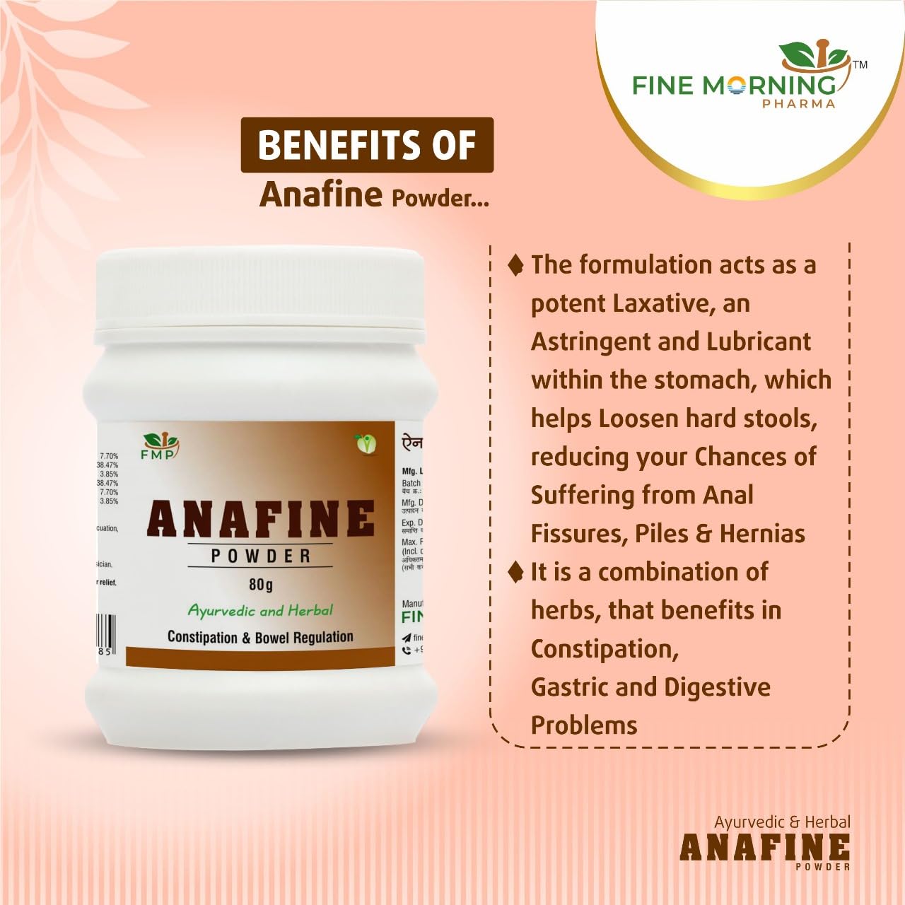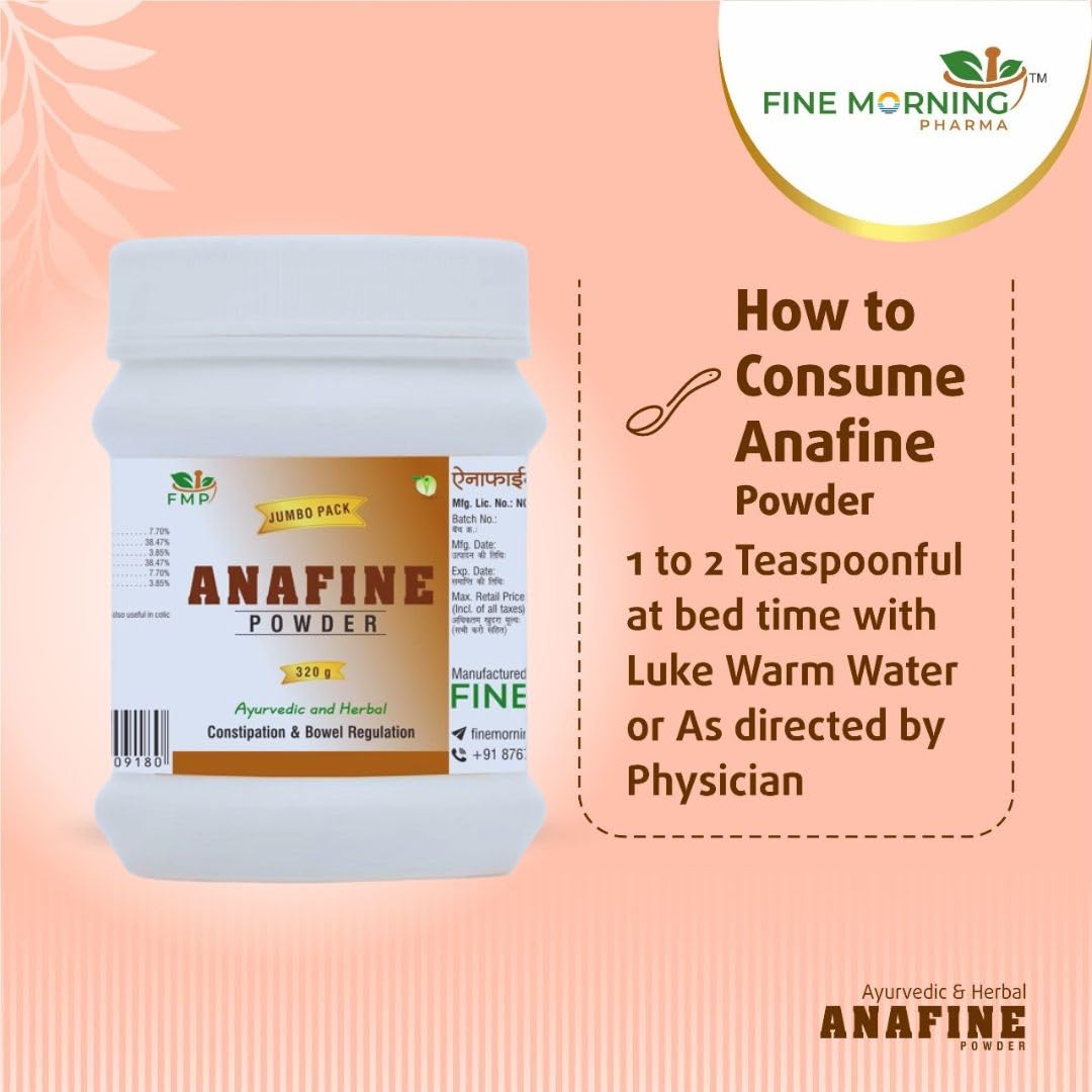 Indication Anafine powder is an ayurvedic herb which helps in digestion and a great formula for treating constipation.