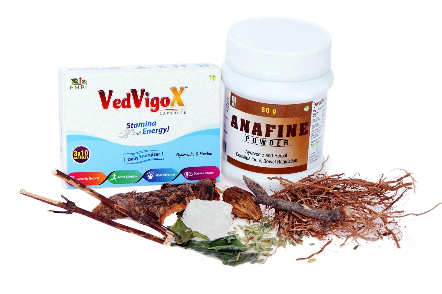 Fine Morning Pharma | Ayurvedic and Herbal Combo Pack of 2 VedVigoX Capsules & Anafine Powder Useful to Boost Stamina Relief Anxiety & Depression Enhance Digestion & Constipation Problems