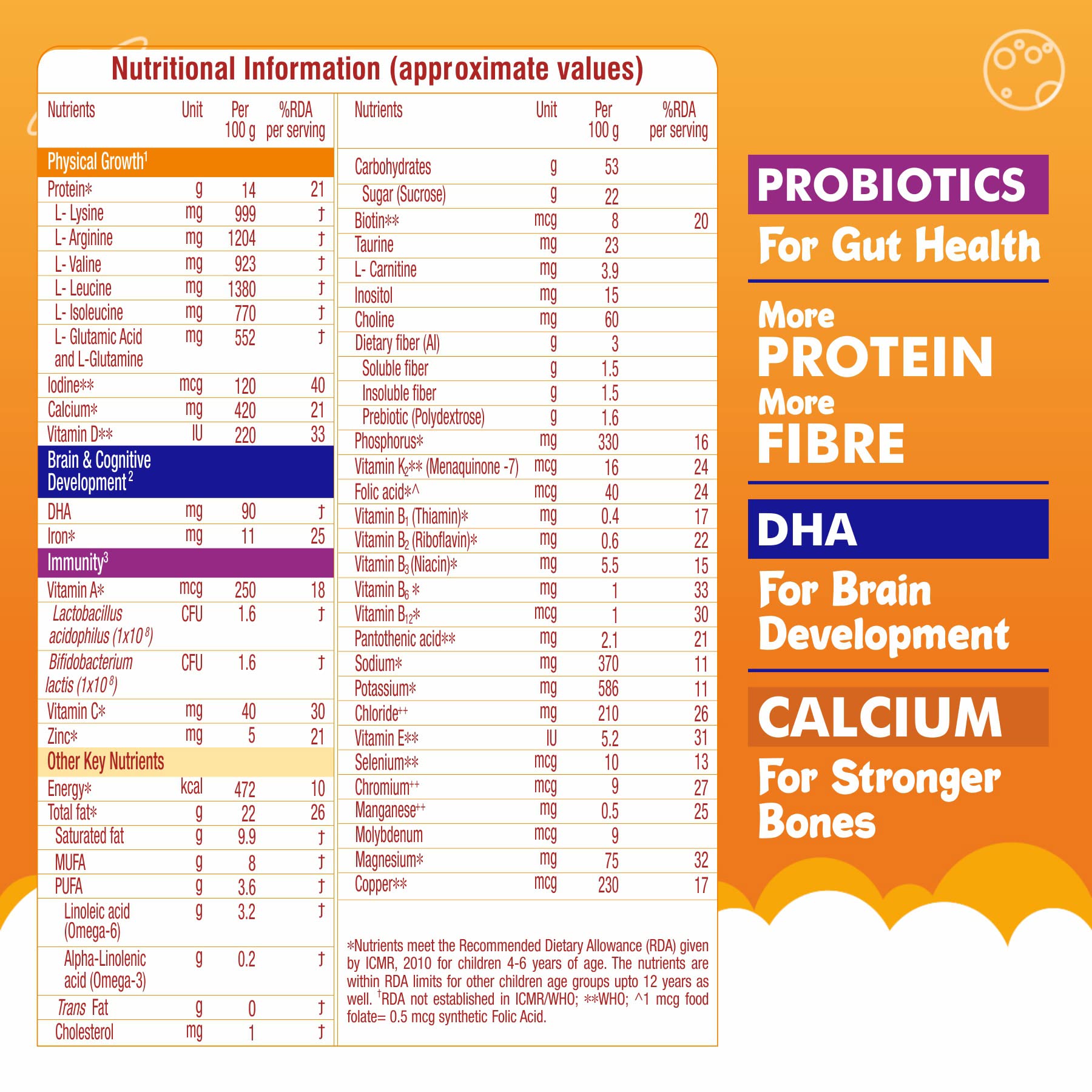 Certi5 signature nutrients in Groviva are provided in quantities that support your child's growth & development cognitive & function and & bone health. Groviva is designed as per nutritional requirements provided by ICMR for 2-12 years of age