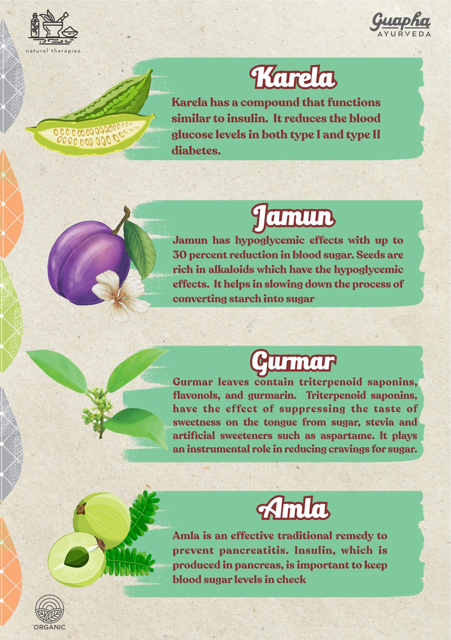 Improves Blood Sugar Metabolism : These natural extracts in Guapha Ayurveda Diabetes Wellness tablets helps regulate blood glucose levels in your body which will fight against your rising sugar levels