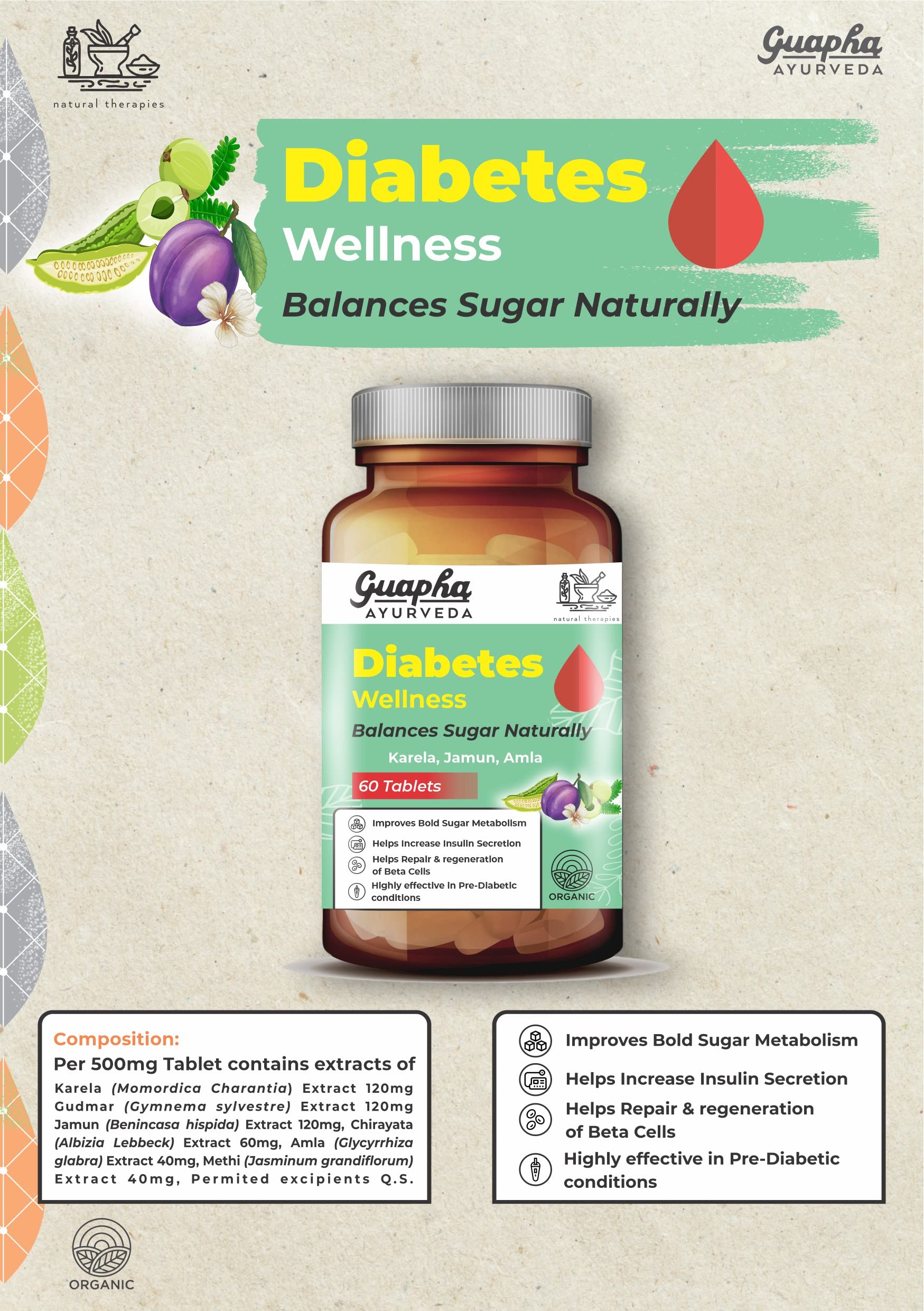 Guapha Ayurveda Diabetes Wellness | Balances Sugar Naturally Controls Diabetes and Helps Increase Insulin Secretion | With Goodness of Herbal Extracts of Karela Jamun Gudmar Methi Amla | 60 Ayurvedic Tablets