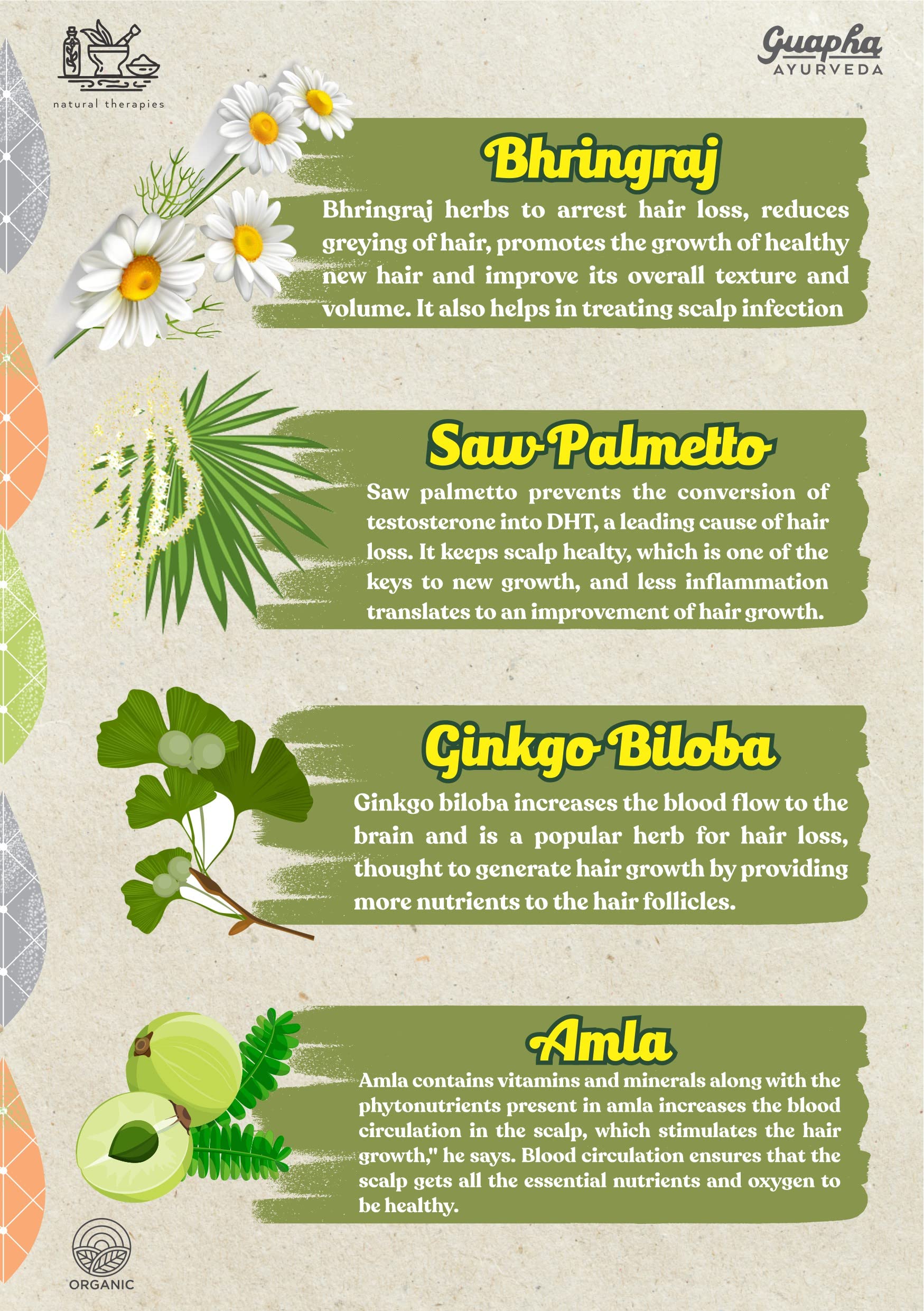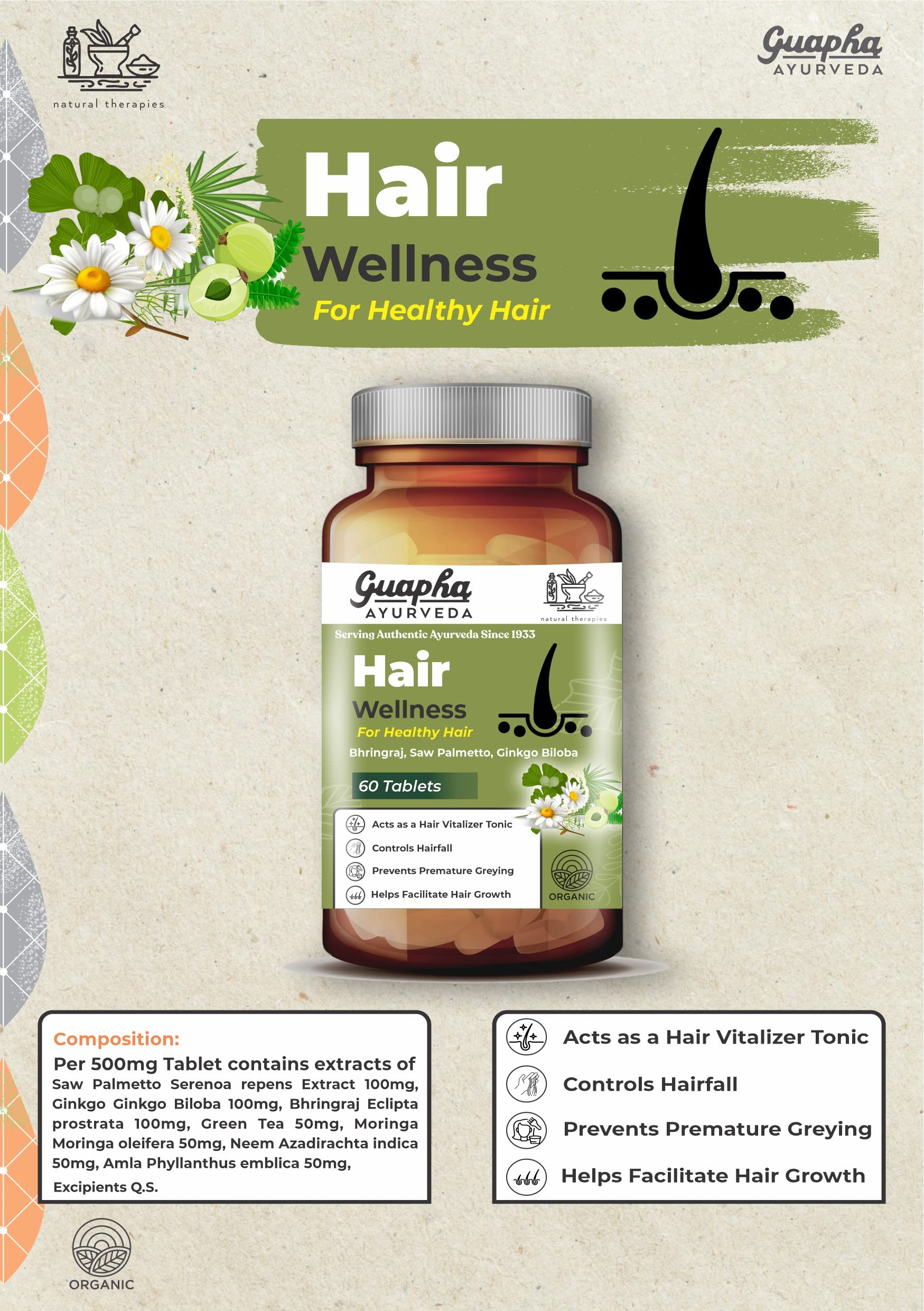 Guapha Ayurveda Hair Wellness | For Healthy Hair | With Herbal Extracts Of Bhringraj Saw Palmetto Ginkgo Biloba Green Tea Moringa Neem Amla | 60 Tablets