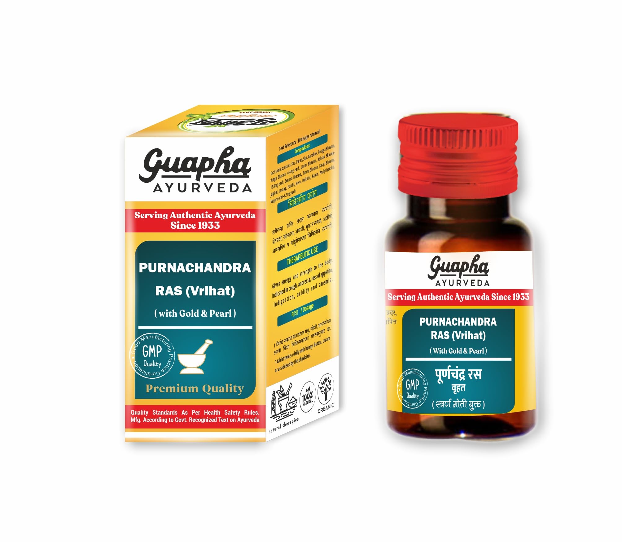 Guapha Ayurveda Puranchand Ras Vrihat (With Gold & Pearl) is a potent Ayurvedic formulation designed to enhance vitality and support immune health. Crafted with a blend of traditional herbs and minerals this tonic helps nourish the body boost energy levels and improve overall well-being. Ideal for combating fatigue and restoring strength Puranchand Ras works to balance doshas and promote healthy digestion. With ingredients like Shuddha Parad and Swarna Bhasma this formulation is effective in rejuvenating the body and supporting a robust immune response. Experience the transformative benefits of Puranchand Ras for a healthier more vibrant life through the wisdom of Ayurveda.