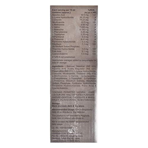 Composition: Each serving for 15 ml contains (approx): Ascorbic Acid 40.0mg. L-Lysine Hydrochloride 26.25mg. L-Leucine 19.21mg. Nicotinamide 12.0mg. L-Methionine 9.66mg. L-Valine 7.035mg. L-Isoleucine 6.195mg. L-Phenylalanine 5.25mg. L-Tryptophan 5.25mg. D-Panthenol 5.0mg. L-Threonine 4.41mg. Pyridoxine Hydrochloride 1.5mg. Riboflavin 1.1mg. (As Riboflavin Sodium Phosphate) Thiamine Hydrochloride 1.0mg. Folic Acid 0.1mg. Cyanocobalamin 1.0 mcg. # %RDA not established. Appropriate overages added to compensate for loss on storage. Ingredients: Sucrose Stabilizer (INS 420) Ascorbic Acid Acidity Regulator (INS 330) Preservative (INS 211) L-Lysine Hydrochloride L-Leucine Nicotinamide Thickener (INS 415) L-Methionine L-Valine L-Isoleucine L-Phenylalanine L-Tryptophan D-Panthenol L-Threonine Disodium Edetate Riboflavin Sodium Phosphate Pyridoxine Hydrochloride Thiamine Hydrochloride Folic Acid & Cyanocobalamin. Contains: Permitted natural food colour (ins 150a) and added flavours (nature-identical chocolate & mixed fruit flavouring substances).