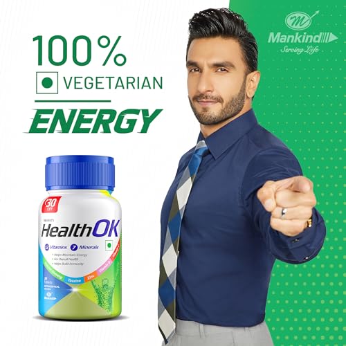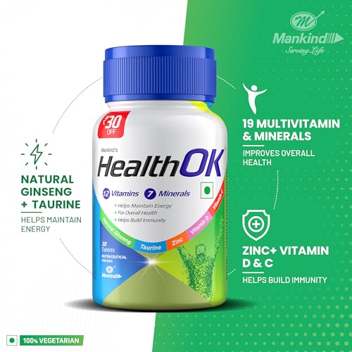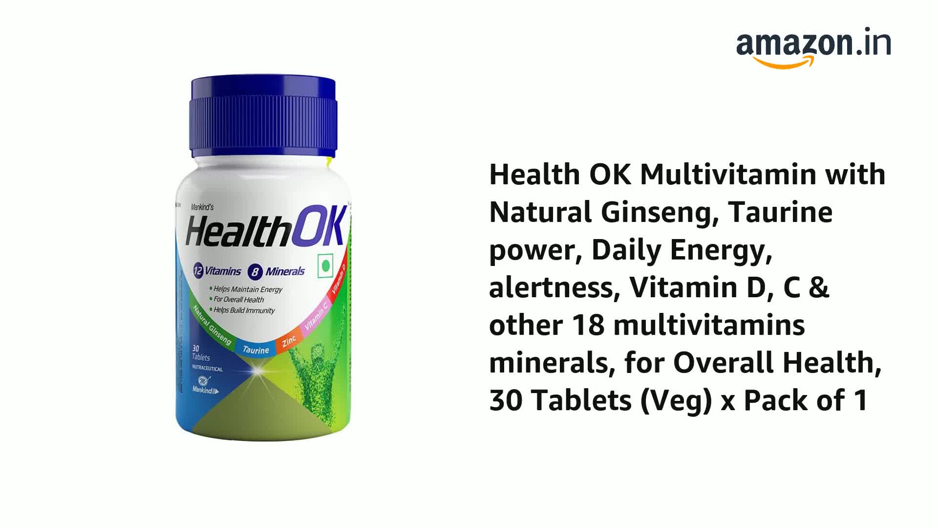 A Hectic routine fast-paced lifestyle and age are some of the major factors that soak up your vigour and leave you all drained. To overcome this you need a supplement that can keep you active 24x7 and maintain your energetic self helping you overcome all the tiresomeness and fatigue. Itâs time you take Health Ok an effective supplement by Mankind comprising of essential multivitamins minerals and amino acids that give you 24 hours of active energy. Health Ok formulation contains Natural Ginseng Taurine Zinc and Vitamin C & D all of which are critical to staying overall energetic healthy concentrated and immune from diseases. So take it daily and experience 365 days of vitality and strong immunity.