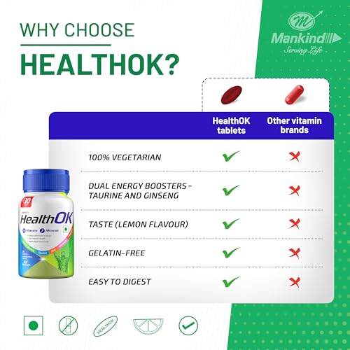 Introducing 100% vegetarian HealthOK your daily source to stay energetic & fit. HealthOK is a multivitamin tablet designed to boost your energy levels and help you tackle the demands of the day with ease. This 100% vegetarian tablet has been especially formulated to provide you with 24-hour active energy & to improve immunity and overall health.Packed with a powerful blend of Natural Ginseng Taurine Power and 19 vitamins and minerals HealthOK tablets goes beyond the ordinary. The inclusion of natural ingredients like Ginseng and Taurine helps boosting energy levels and promoting overall well-being. Not just an energy booster HealthOK also contributes to your overall health and immunity.By incorporating just one tablet of 100% vegetarian HealthOK into your daily routine you can experience an increase in your energy levels required to excel in both professional and personal tasks. Whether it's a busy workday hitting the gym or managing household responsibilities HealthOK helps you live a balanced life without compromising on your well-being. It also has a refreshing lemon flavour that adds a zesty twist to your daily routine.Choose HealthOK â the multivitamin tablet that not only meets your daily energy requirements but also promotes improved overall health and immunity. Turn on screen reader support