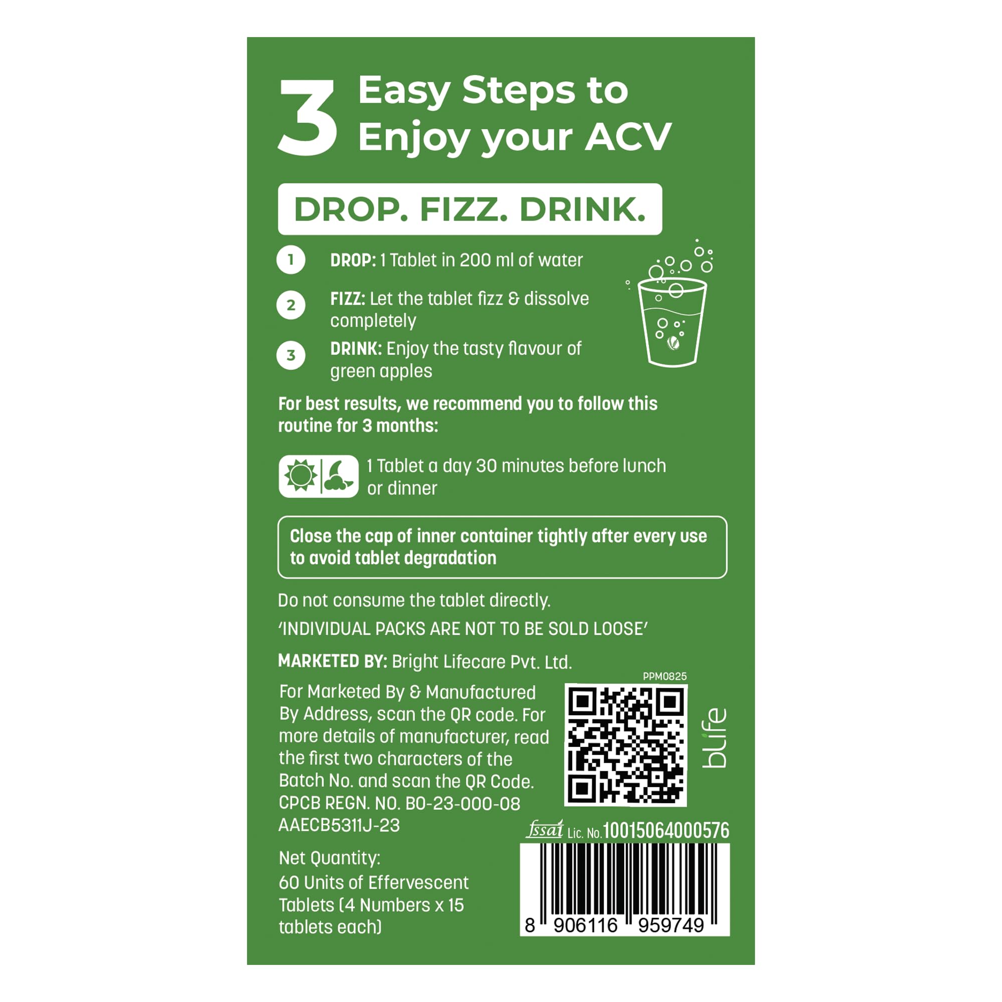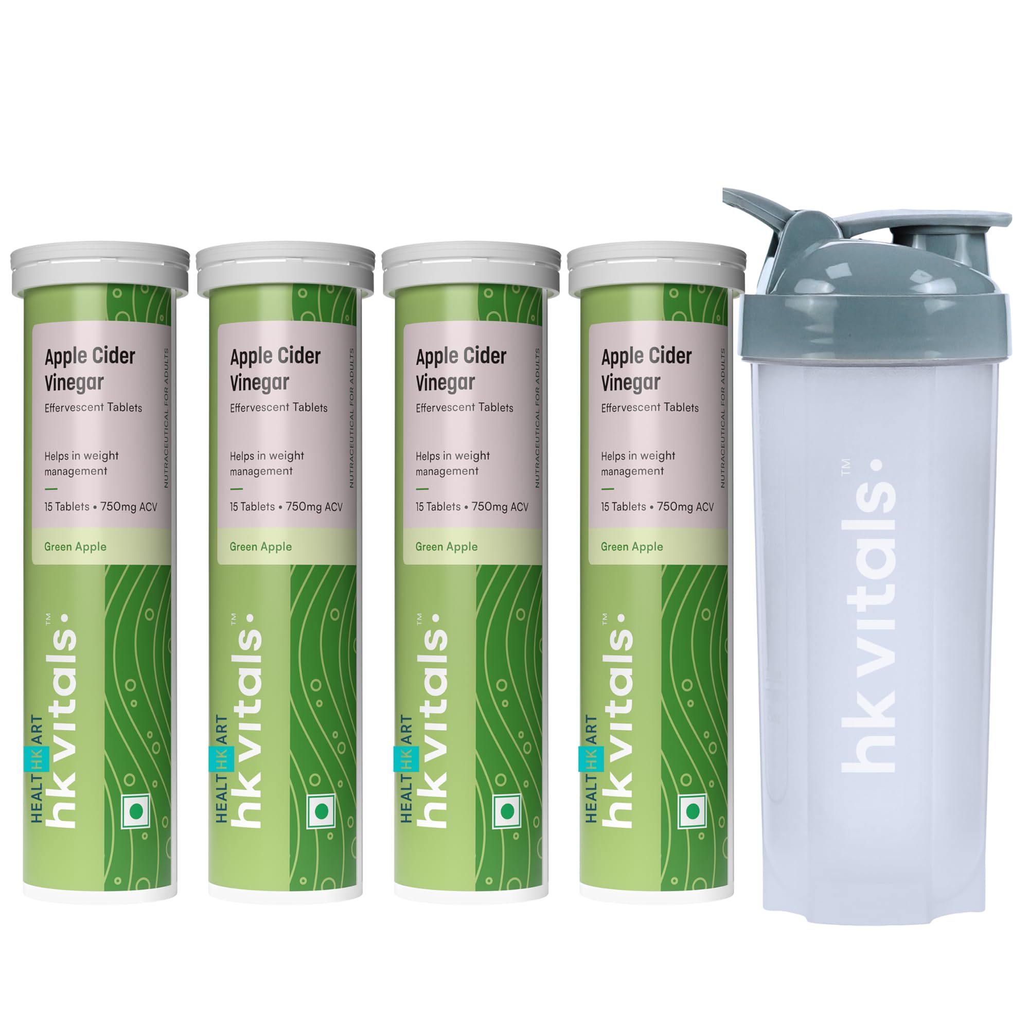 HealthKart HK VITALS Apple Cider Vinegar 750mg (Green Apple 15 Effervescent Tablets Each (Pack of 4) with Shaker 650ml) | For Weight Management & Gut Health Supports Digestion