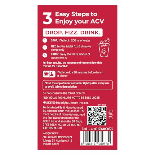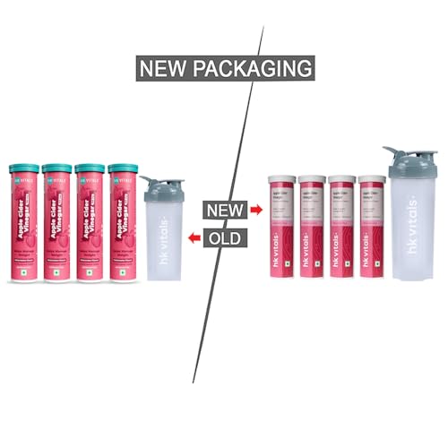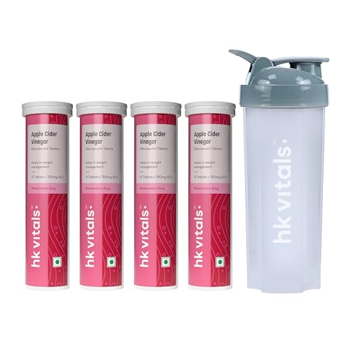 Sparkling health in a tablet- the fizzlicious way to consume apple cider vinegar! HealthKart HK Vitals Apple Cider Vinegar is Indiaâs first 750 mg apple cider vinegar tablet which is effervescent; Available in tasty green apple & watermelon flavours. HK Vitals Apple Cider Vinegar promotes weight management by keeping you full for longer. Apple cider vinegar tablet has natural acidic properties that help balance stomach acids reducing bloating and gas and improving digestion. Apple Cider Vinegar contains acetic acid which increases the activity of enzymes that improve our metabolism so our body burns calories faster. Apple Cider Vinegar is also enriched with Vitamin B6 & B12 to help fat mobilization & energy production while pomegranate extract helps boost immunity. It has no added sugar or preservatives & is 100% vegetarian. Get HealthKart HK Vitals ProteinUp Shaker Bottle of 600 ml capacity for easy mixability with apple cider vinegar effervescent tablets. To minimise messy spills it has a wide-mouth bottle cap that is secured with a tight screw on top