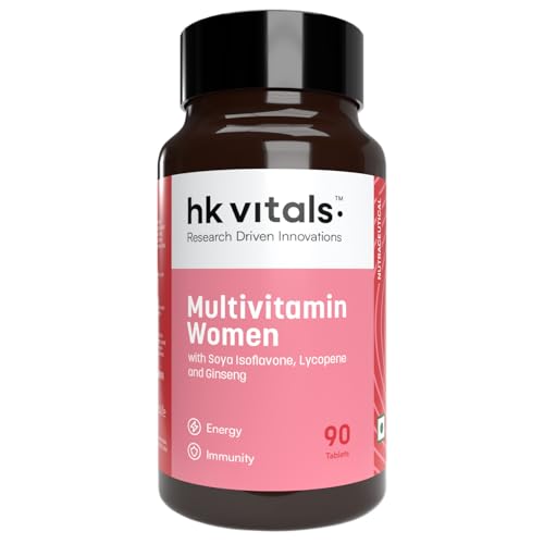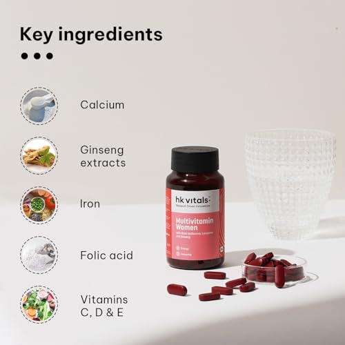 • VITAMINS AND MINERALS BLEND: HealthKart HK Vitals Multivitamin for Women contains 100% RDA of Vitamin C Vitamin D and Vitamin B12 other vitamins and minerals along with Ginseng Extract to help support an active lifestyle by improving energy immunity and s