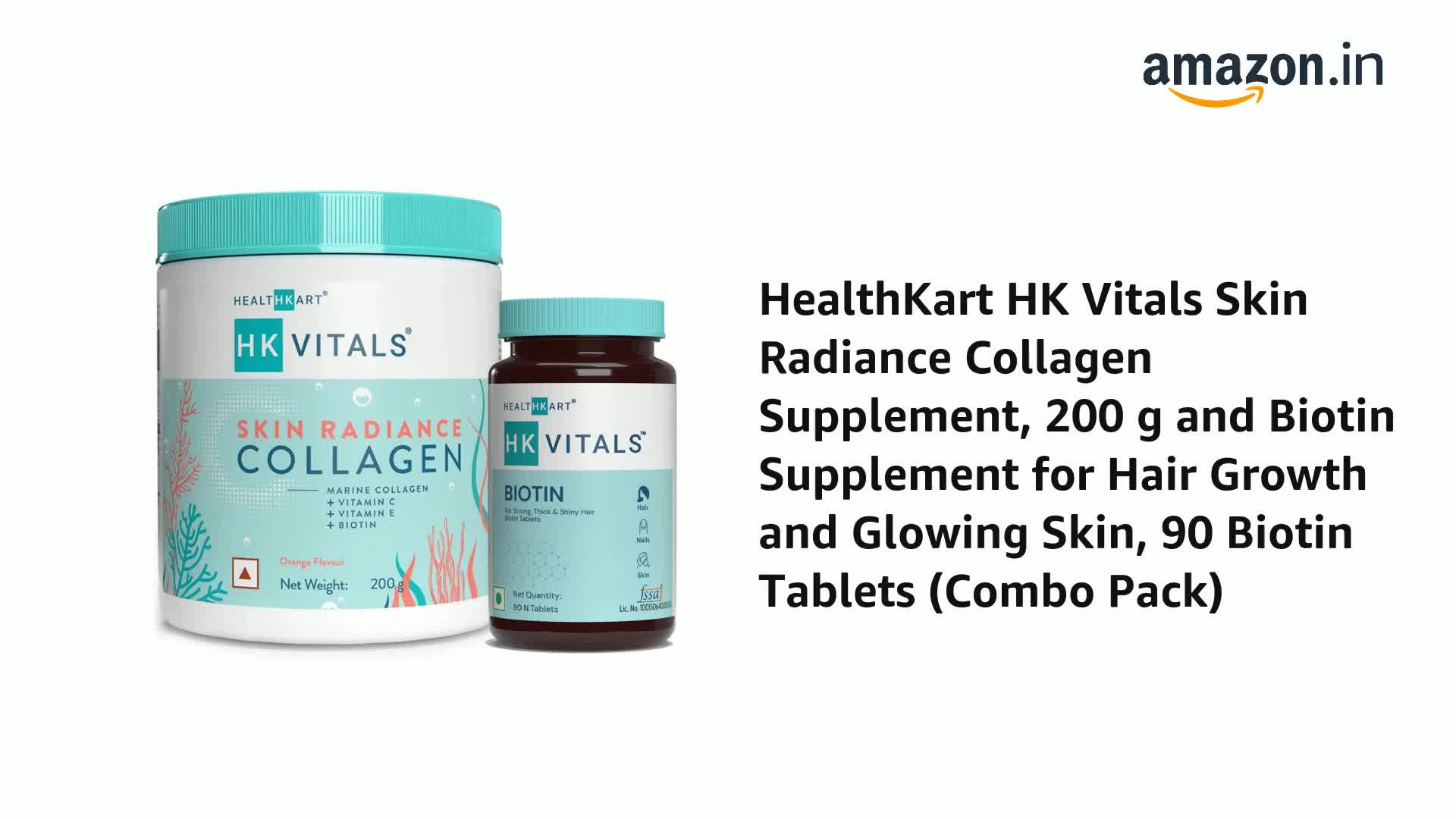 Collagen and biotin supplements complement each other. Get this HealthKart HK Vitals combo that includes Skin Radiance Collagen and Biotin. HealthKart HK Vitals Skin Radiance Collagen is a comprehensive formula for skin hair and nail health. It contains TITAGEN-Fish Collagen Peptide Hyaluronic acid Vitamin C Vitamin E and Biotin. It is available in a delicious orange flavour. The marine collagen content of HK Vitals Collagen (from the house of HealthKart) helps improve the firmness & elasticity of the skin. Hyaluronic acid which is natureâs moisturizer helps keep the skin soft and smooth. Potent antioxidants like Vitamin C and Vitamin E help improve skin glow and control free radical-induced skin damage. Further biotin included in this collagen supplement for men and women helps maintain nail and hair health through its role in keratin protein synthesis. HealthKart HK Vitals Biotin is a Vitamin B7 dietary supplement that assures your body of the required dosage of Vitamin B7 which is essential for keratin synthesis and building keratin infrastructure in your body. Biotin helps in hair growth provides radiance to the skin and fights nail brittleness. It metabolises fats and protein to provide energy and fight fatigue. Consume one biotin tablet daily or as suggested by your dietician.