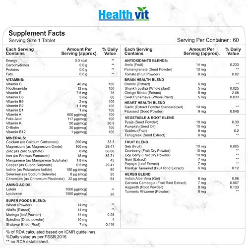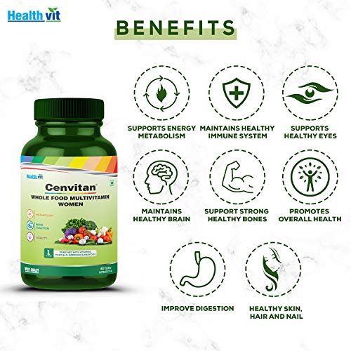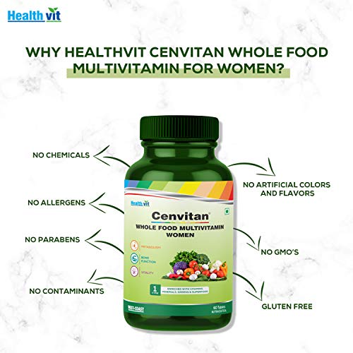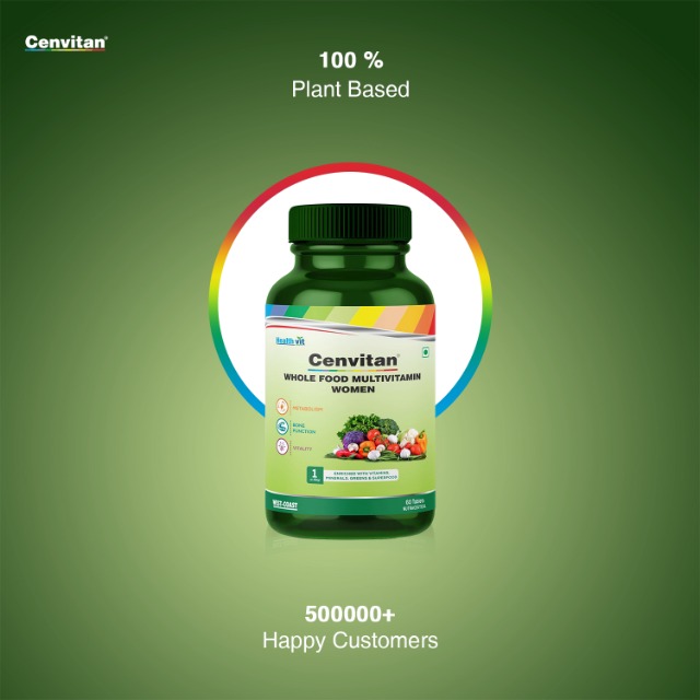 Specially formulated Cenvitan Whole Food Multivitamin for Women made from plant based whole foods. We have fortified your Plant based Multivitamin supplement with real vitamins in a single tablet so that you get what is promised. Get your daily dose of multivitamin with Cenvitan Whole Food Multivitamin for men. Whole Food multivitamins tablets help bridge some nutrient gaps so you can meet the recommended amount of nutrients. [Ingredients:] Vitamin C Nicotinamide Vitamin E Vitamin B5 Vitamin B6 Vitamin B1 Vitamin B2 Folic Acid Vitamin A Vitamin K D-Biotin Vitamin B12 Calcium Magnesium Zinc Iron Manganese Copper Iodine Selenium Chromium Lutein Lycopene Wheat Powder Alfalfa Extract Moringa Leaf Spirulina Powder Shatavari Extract Amla (Fruit) Pomegranate (Seed) Tomato (Fruit Powder) Brahmi Extract Shankhpushpi (Whole Plant) Ginkgo Biloba Extract Swet Punarnava (Whole Plant) Garlic (Extract) Flaxseed (Seed Extract) Pyaja (Seed Powder) Pumpkin (Seed Oil) Gokhru (Fruit) Fenugreek (Seed Extract) Seb (Fruit) Cranberry Fruit Dry Powder Goji Berry Fruit Dry Powder Noni Extract Papaya Leaf Extract Malabar Tamarind Fruit Rind Extract Aloe Vera Gel Garcinia Cambogia (Fruit Rind Powder) Asgandh (Root Powder) Turmeric Rhizome Powder [Suggested Use:] One tablet Daily or as directed by the healthcare practitioner