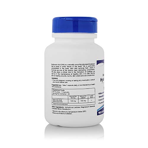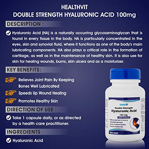 Hyaluronic acid (ha) is a naturally occurring glycosaminoglycan that is found in every tissue in the body. Ha is particularly concentrated in the eyes skin and synovial fluid where it functions as one of the body's main lubricating components. Ha also plays a critical role in the formation of cartilage as well as in the maintenance of healthy skin. It is also use for skin for healing wounds burns skin ulcers and as a moisturizer. Amount per serving  100 mg amount per capsule  100 mg. Reap the benefits of hyaluronic acid - hyaluronic acid is known to support healthy joints and connective tissue and to enhance the health of the skin Healthvit hyaluronic acid capsules give you 100 mg of this beneficial natural substance. Make skin youthful - helps maintain youthful skin by enhancing the structure and volume of the skin by promoting connective tissues.