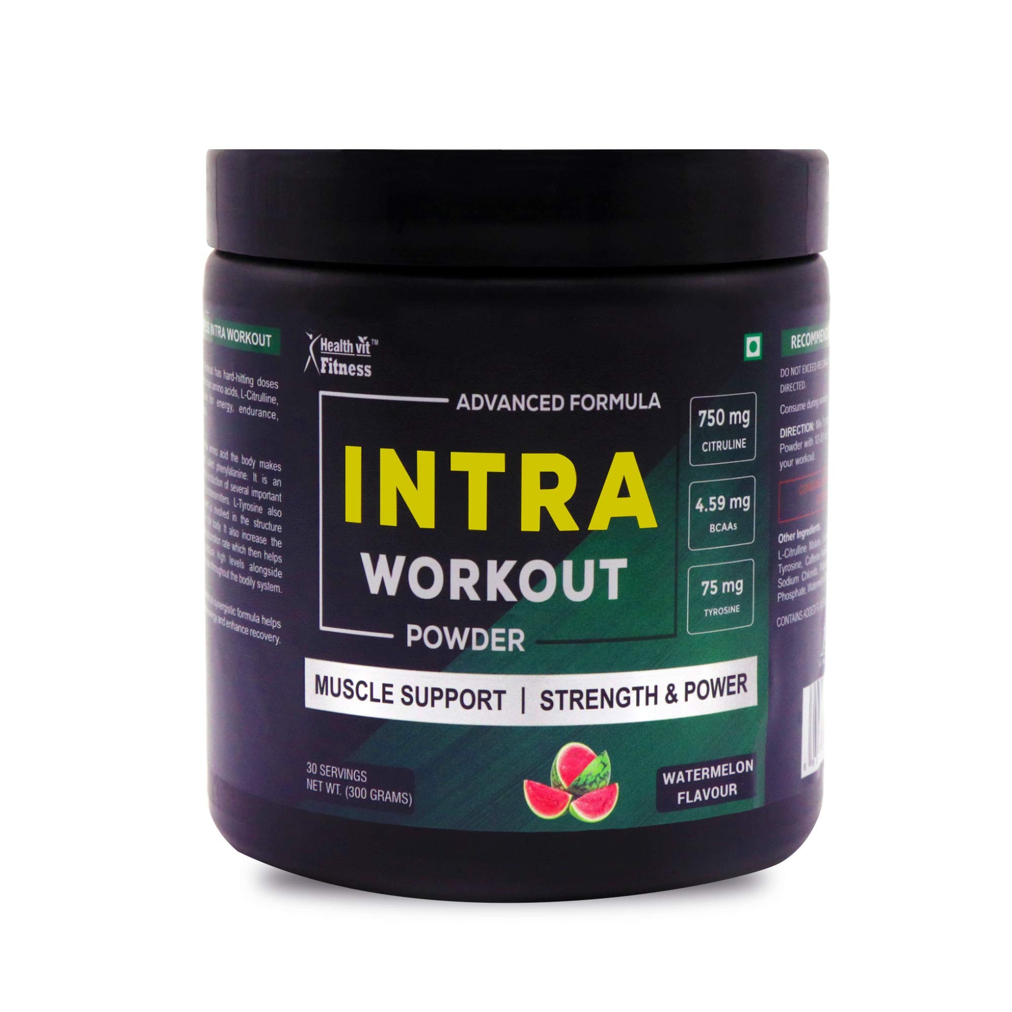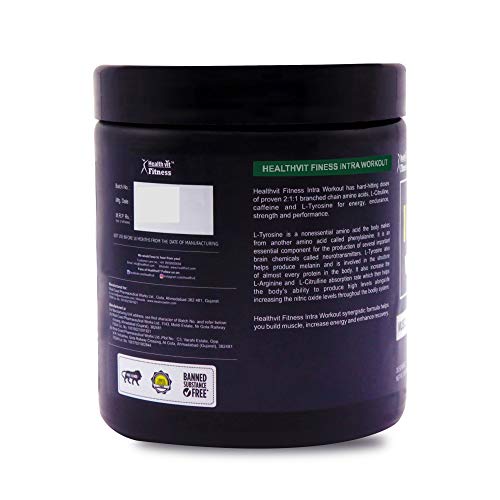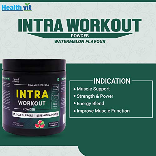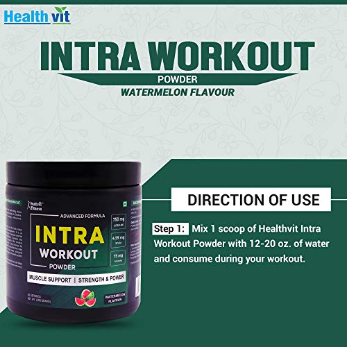 Healthvit fitness intra workout powder advanced formula 300 gm watermelon flavour. Healthvit fitness intra workout. Healthvit fitness intra workout has hard-hitting doses of proven 2: 1: 1 branched chain amino acids l-citrulline caffeine and l-tyrosine for energy endurance strength and performance. L-tyrosine is a nonessential amino acid the body makes from another amino acid called phenylalanine. It is an essential component for the production of several important brain chemicals called neurotransmitters. L-tyrosine also helps produce melanin and is involved in the structure of almost every protein in the body. It also increases the l-arginine and l-citrulline absorption rate which then helps the body's ability to produce high levels alongside increasing nitric oxide levels throughout the bodily system. Healthvit fitness intra workout synergistic formula helps you build muscle increase energy and enhance recovery. 1. Muscle support. 2. Strength and power. Ingredients: l-citrulline malate 750 mg bcaas 4. 59 mg tyrosine 75 mg l-leucine 1. 5g l-isoleucine 1. 5g l-tyrosine caffeine anhydrous. Suggested use: mix 1 scoop of healthvit intra workout powder with 12-20 oz. Of water and consume during your workout.
