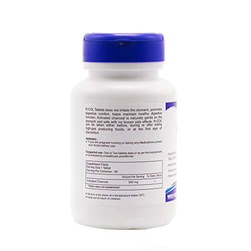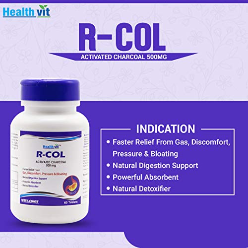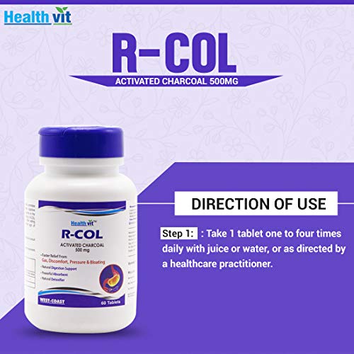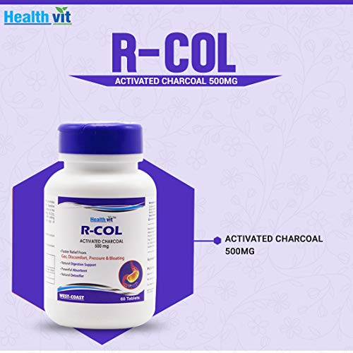 Healthvit R-COL Activated Charcoal 500mg 60 Tablets R-COL Tablets does not irritate the stomach promotes digestive comfort and helps maintain healthy digestive function. Activated charcoal is naturally gentle on the stomach and safe with no known side effects. R-COL can be taken either before during or after eating high-gas producing foods or at the first sign of discomfort. 1. Faster Relief From Gas Discomfort Pressure & Bloating 2. Natural Digestion Support 3. Powerful Absorbent 4. Natural Detoxifier Ingredients: Activated Charcoal 500mg Suggested Use: Take 1 tablet one to four times daily with juice or water or as directed by a healthcare practitioner.