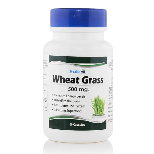 Healthvit 100 percent pure wheat grass 500 mg 60 capsules. Healthvit wheatgrass capsules good source of antioxidants and phytonutrients. Wheatgrass contains about 30 beneficial enzymes. Helps detoxifies and rejuvenates helps increase energy levels naturally boosts the immune system alkalizing super food. One of the most pure and fast selling wheat grass capsules.