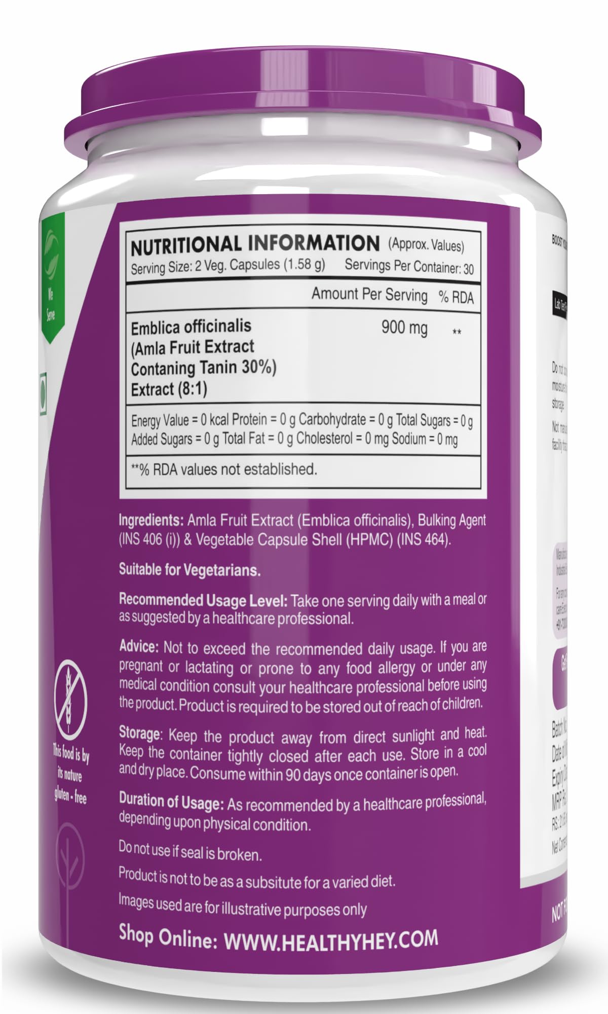 PLANT BASED: HealthyHey Nutrition Amla Extract is NON-GMO and does not contain ingredients of animal origin. Each capsule is also additive free gluten free wheat free corn free soy free and dairy free and banned substance free.