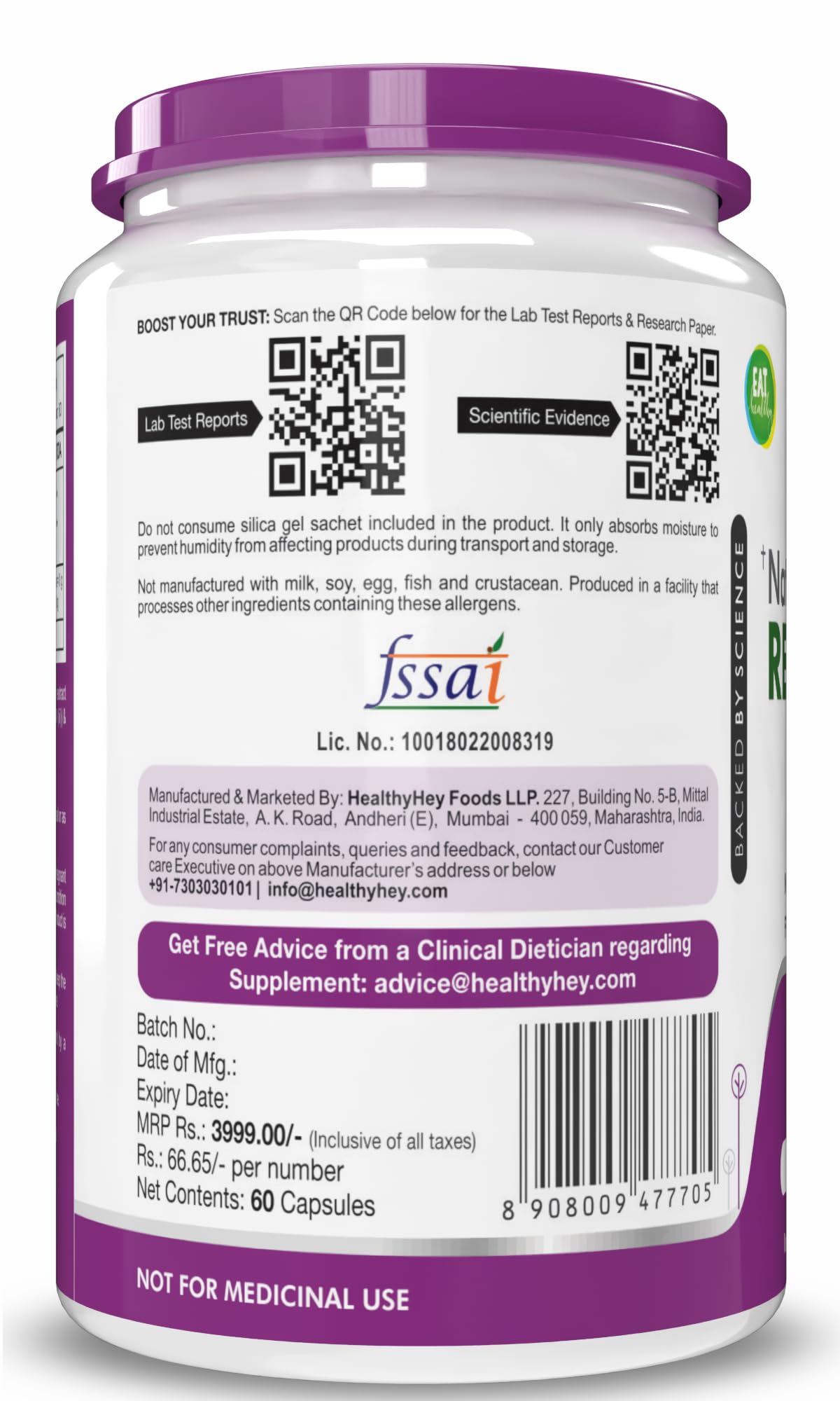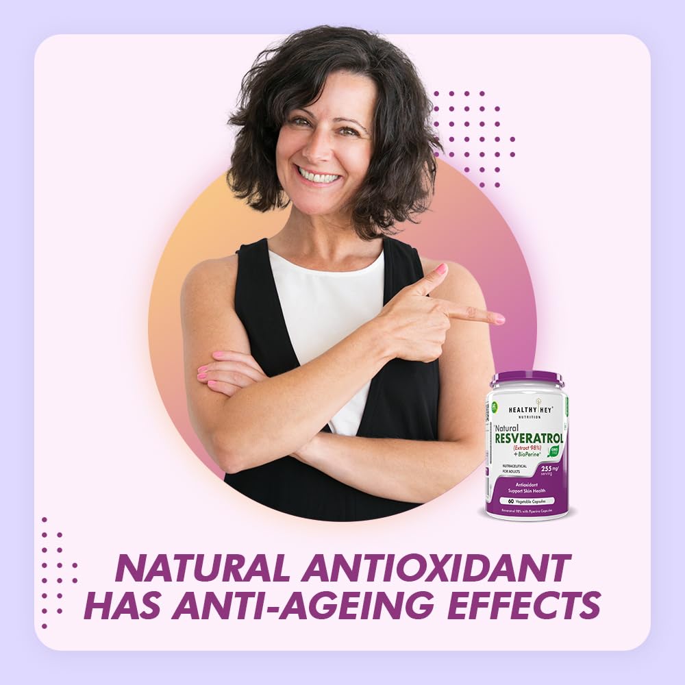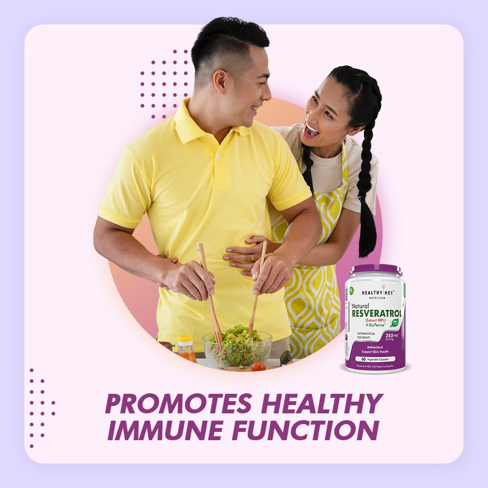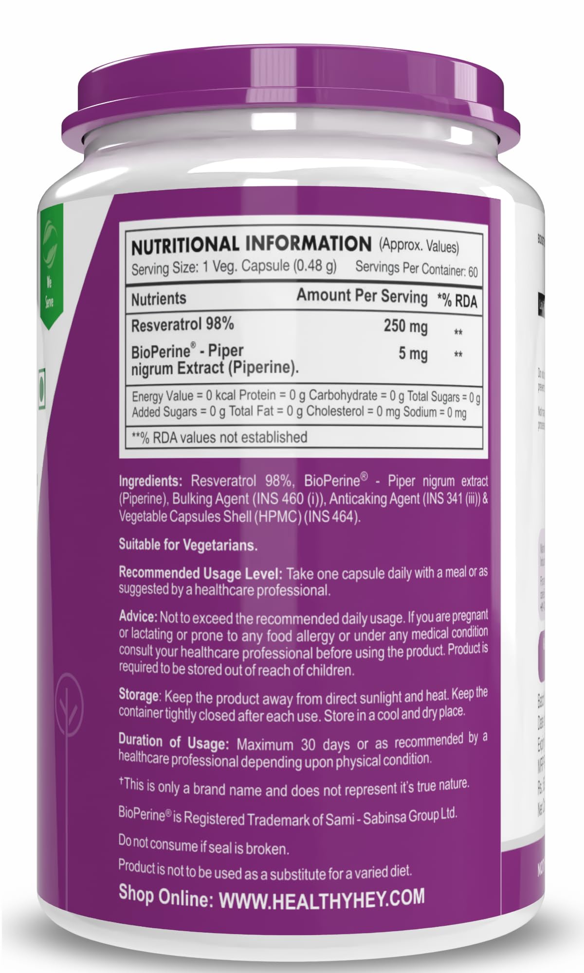 HealthyHey Nutrition Resveratrol Extract 98% Plus BioPerine for Absorption - 255mg - 60 Vegetable Capsules (Pack of 1)