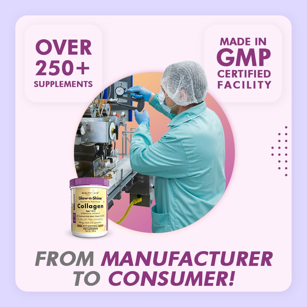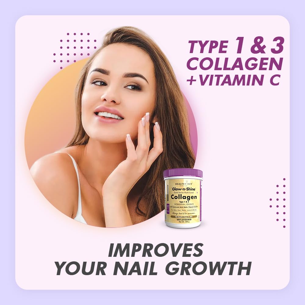 HealthyHey Skin Glow-n-Shine Collagen Powder 200g | Hydrolysed Collagen for Women and Men with Hyaluronic Acid Biotin and Vitamin C for Healthy Skin Hair and Nails - (Unflavoured 200gm)