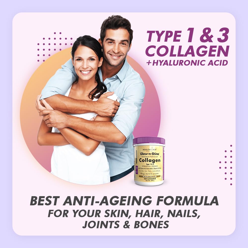 HomeHealth & PersonalDiet & NutritionHealth SupplementsHealthyHey Skin Glow-n-Shine Collagen Powder 200g | Hydrolysed Collagen for Women and Men with Hyaluronic Acid Biotin and Vitamin C for Healthy Skin Hair and Nails - (Unflavoured 200gm)
